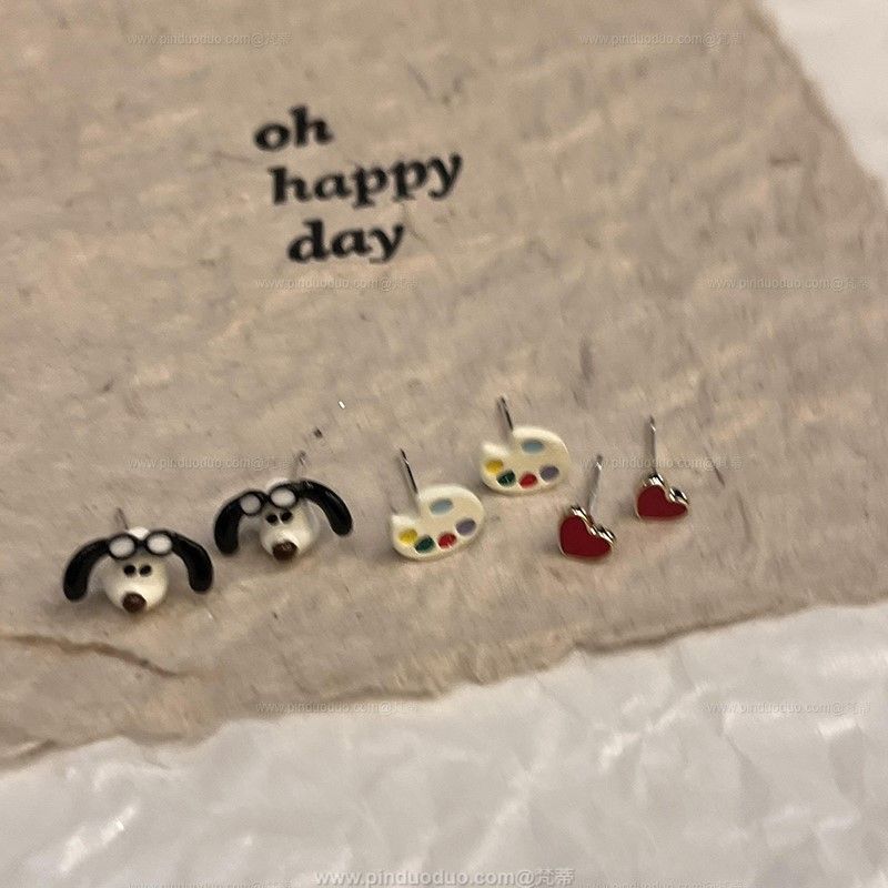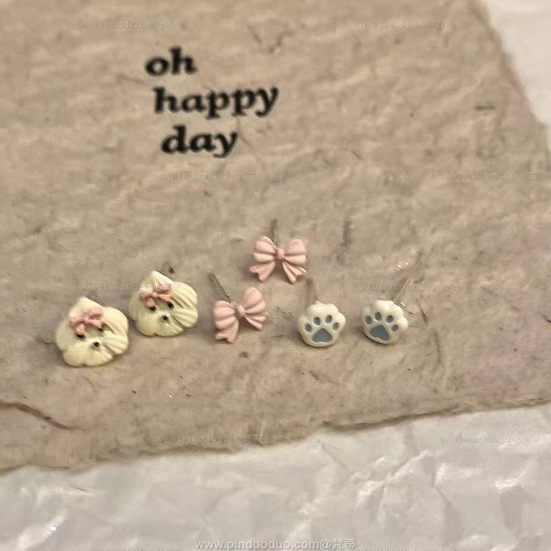 卡通滴油红苹果小狗耳钉套装圣诞风蝴蝶结精致女甜美趣味可爱耳饰