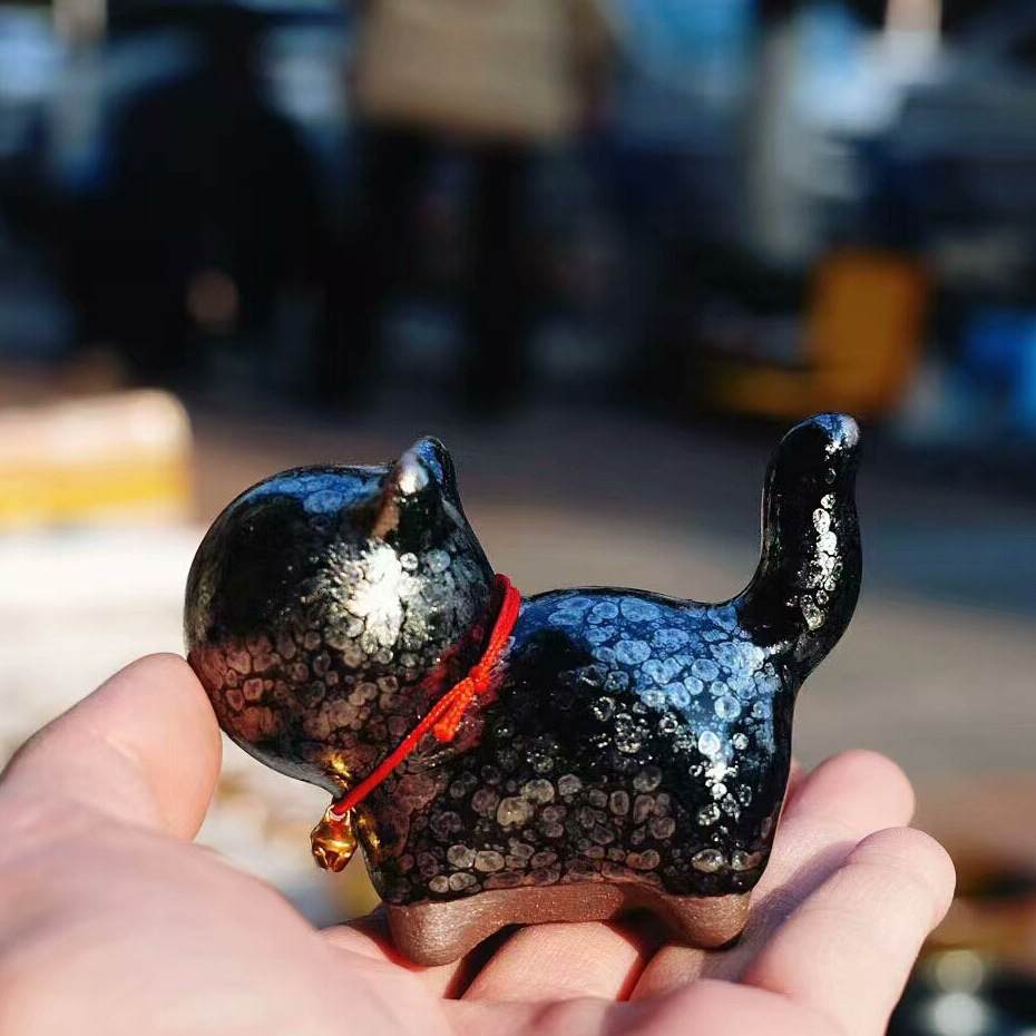 创意建盏可爱猫咪建窑铃铛招财猫可养彩摆件动物茶道桌面饰品茶宠