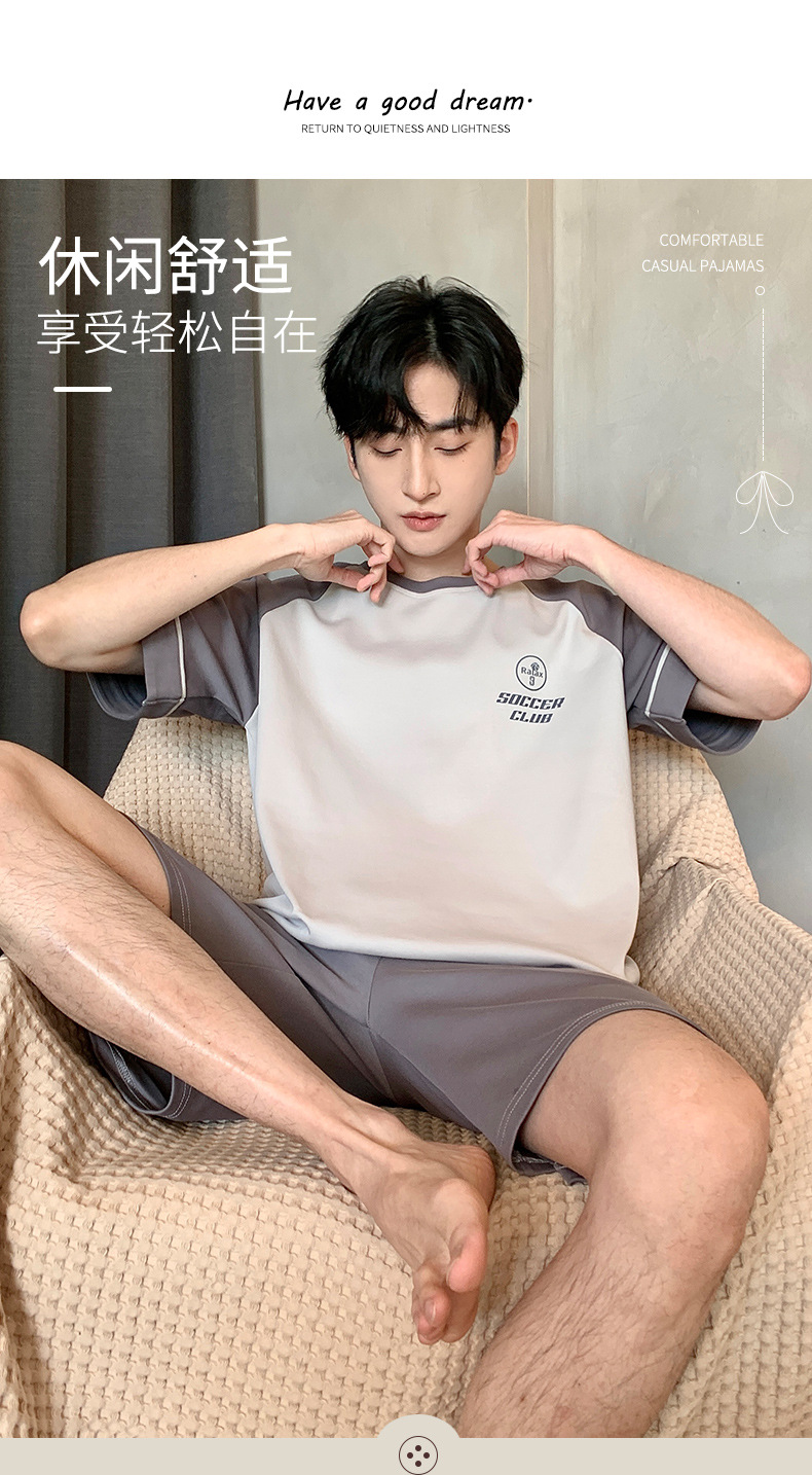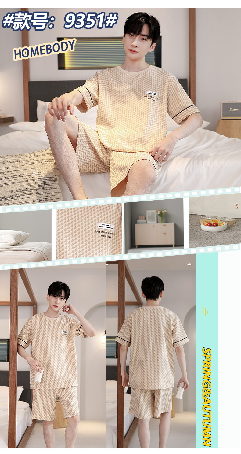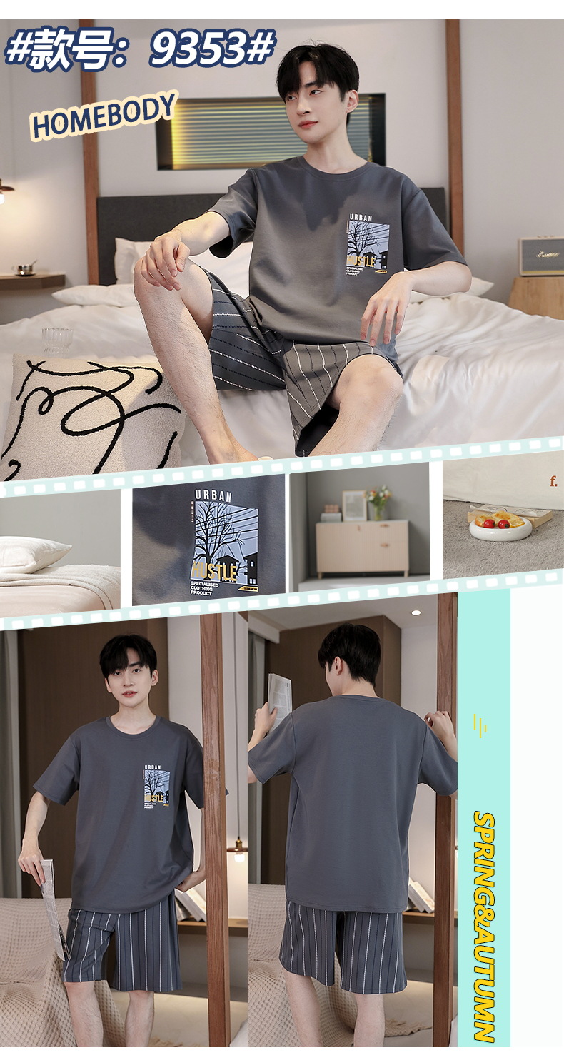 純綿パジャマ男性夏半袖半ズボン薄い丸襟夏は男性綿100% の家庭服セットを着ることができます。