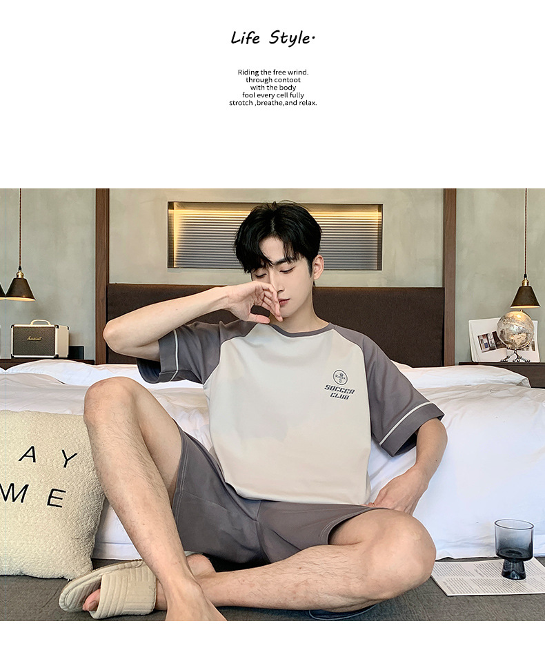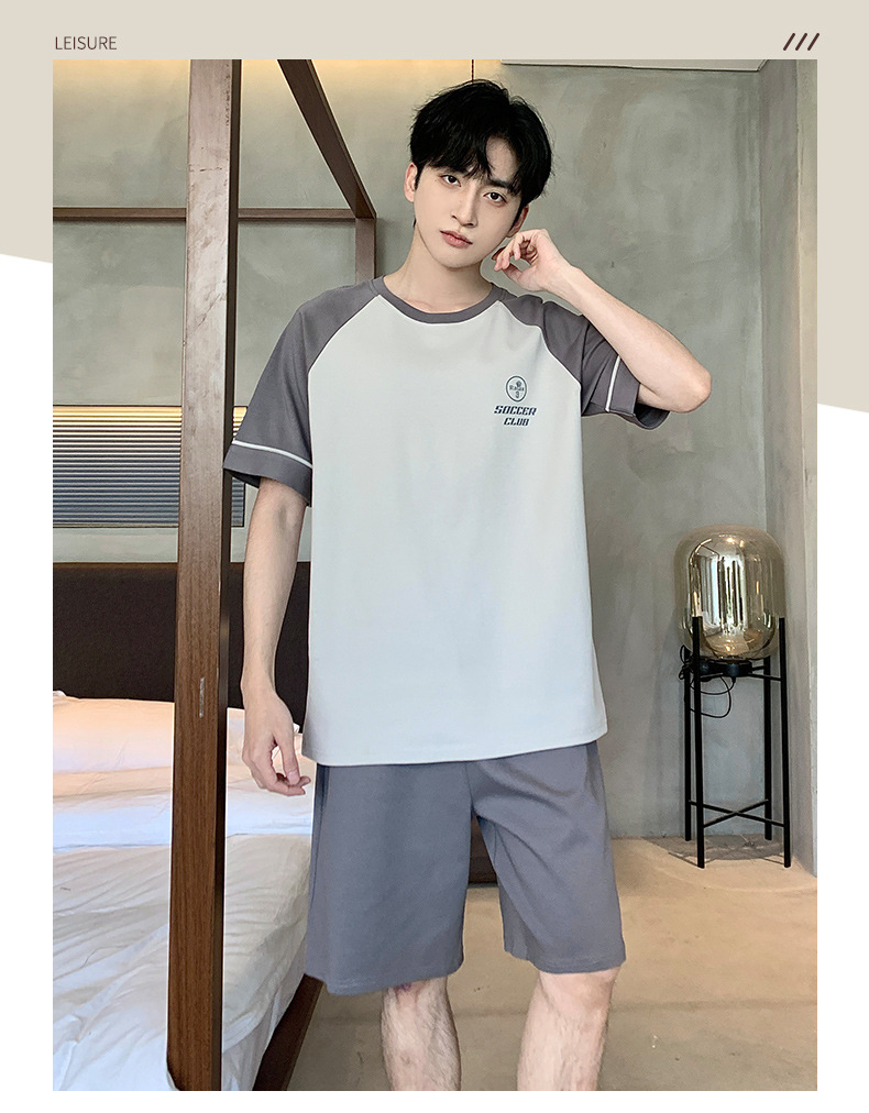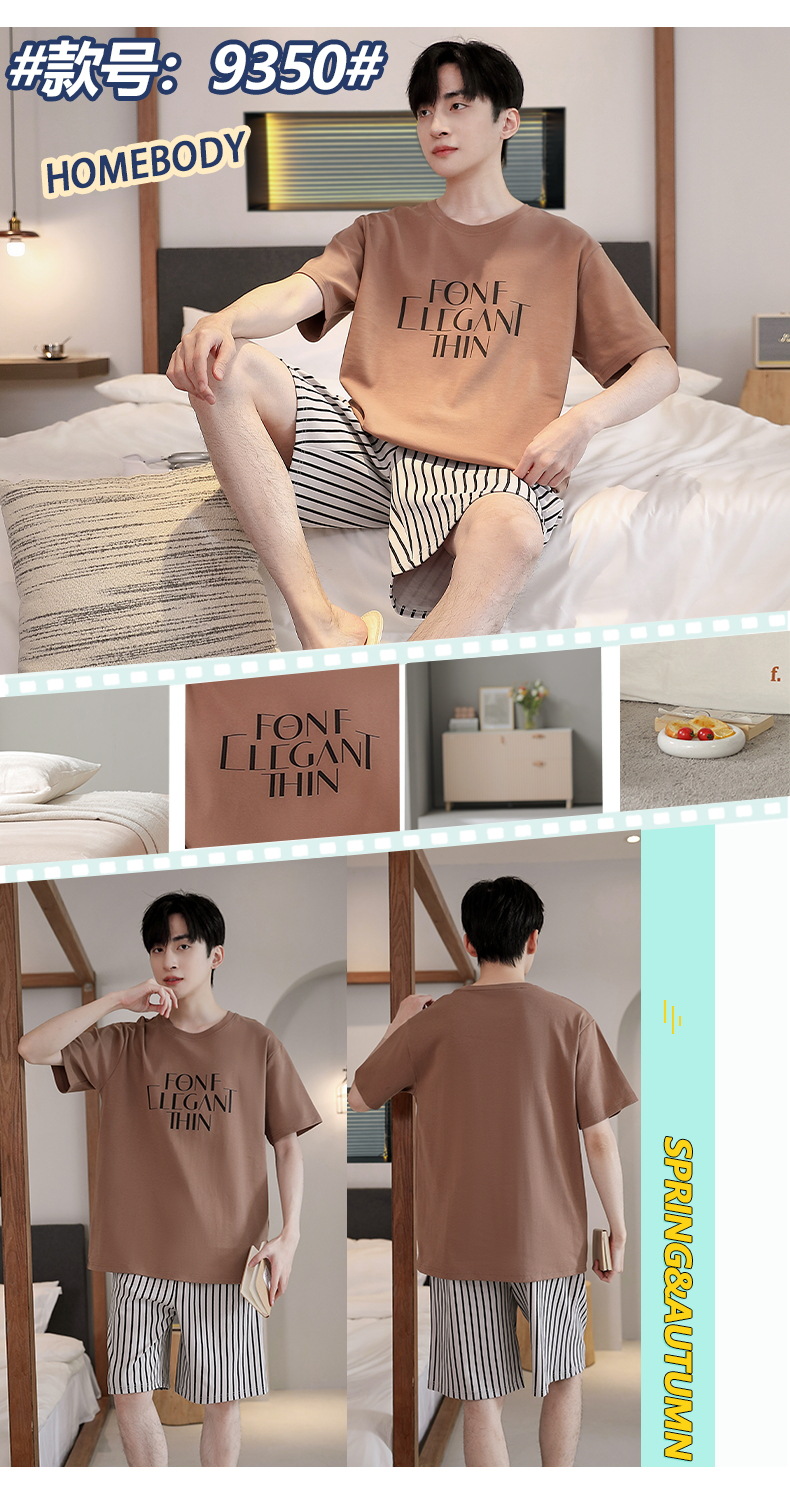 純綿パジャマ男性夏半袖半ズボン薄い丸襟夏は男性綿100% の家庭服セットを着ることができます。