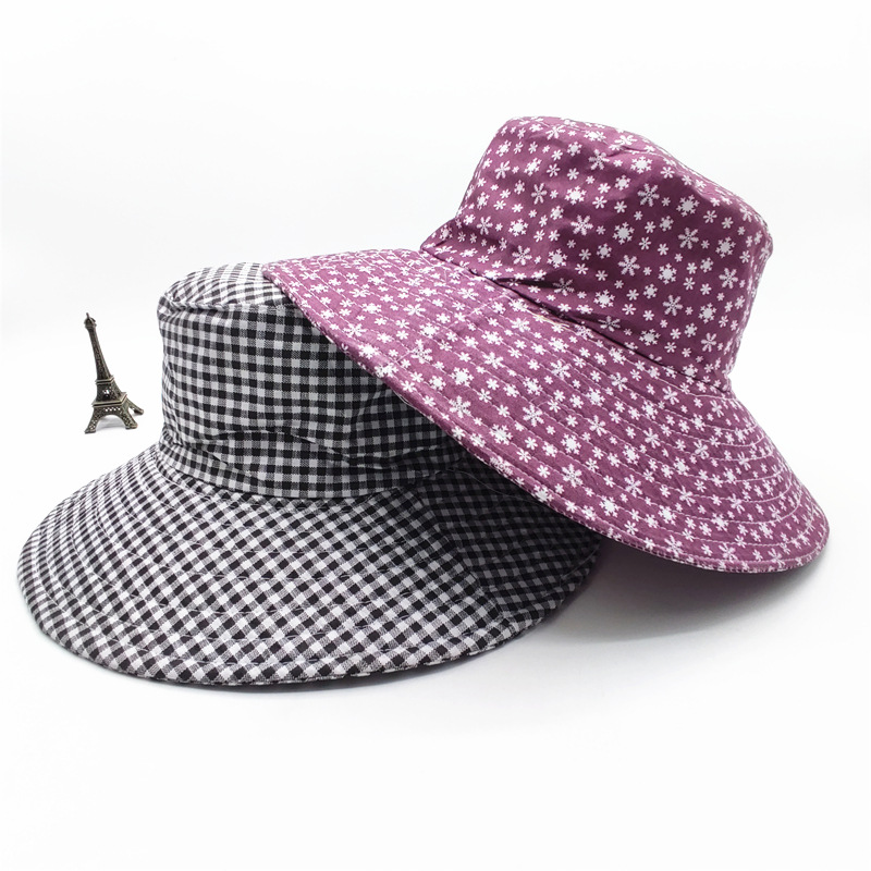 帽子女性春夏季布漁師帽格子盆帽折り畳み戸外日焼け止め大縁日よけ帽労働保護採茶帽