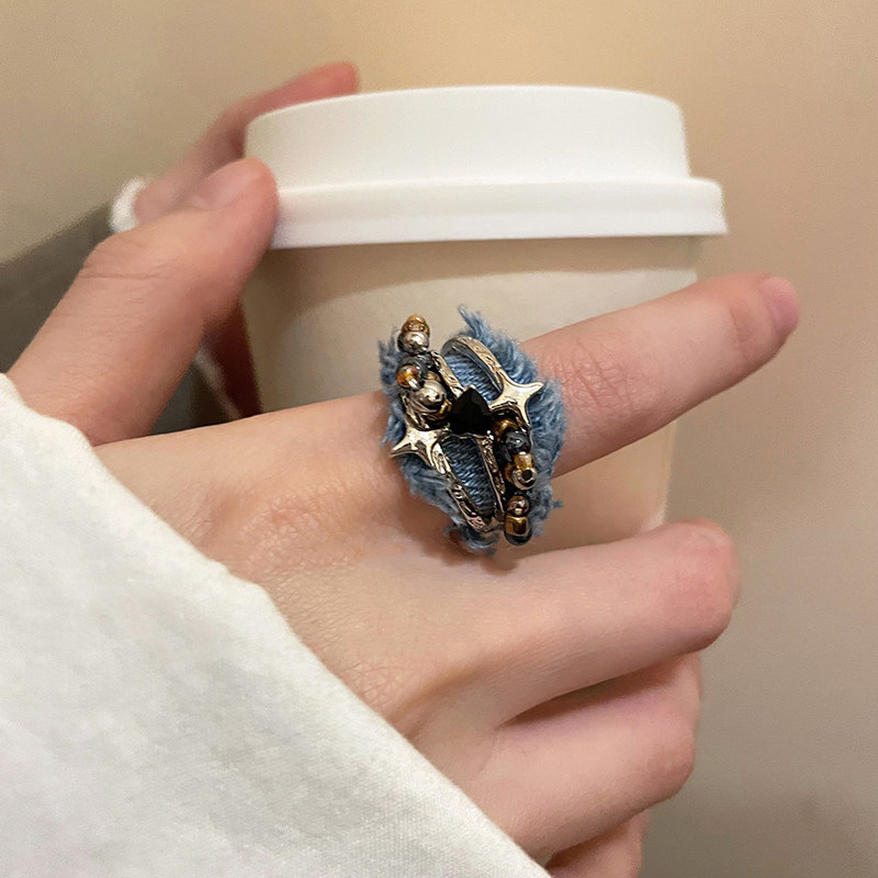 2024新型四芒星デニムビーズ開口指輪女性レトロアメリカ潮クールギャル個性指輪