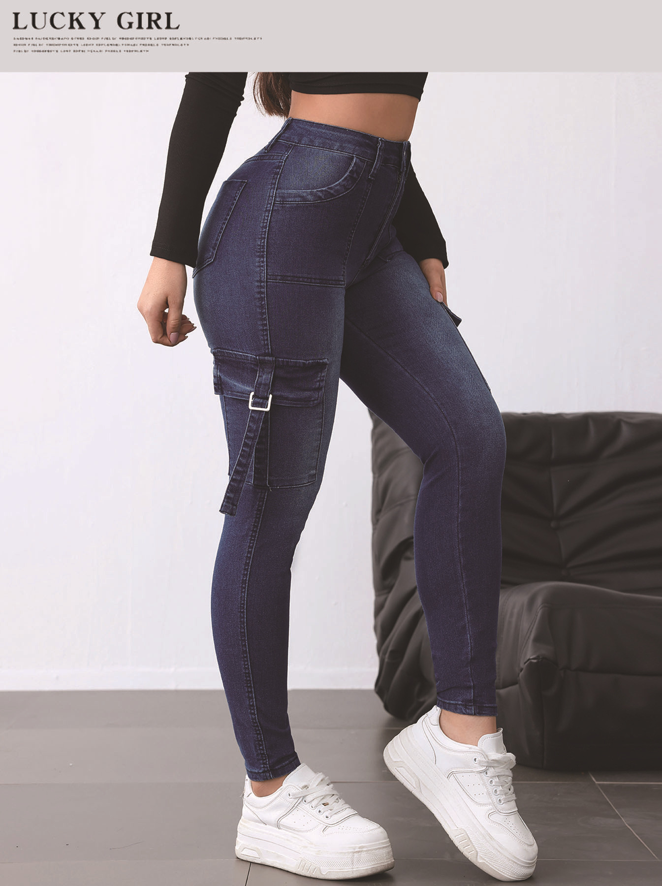 亚马逊wish速卖通弹力系带翻盖口袋修身提臀女牛仔长裤