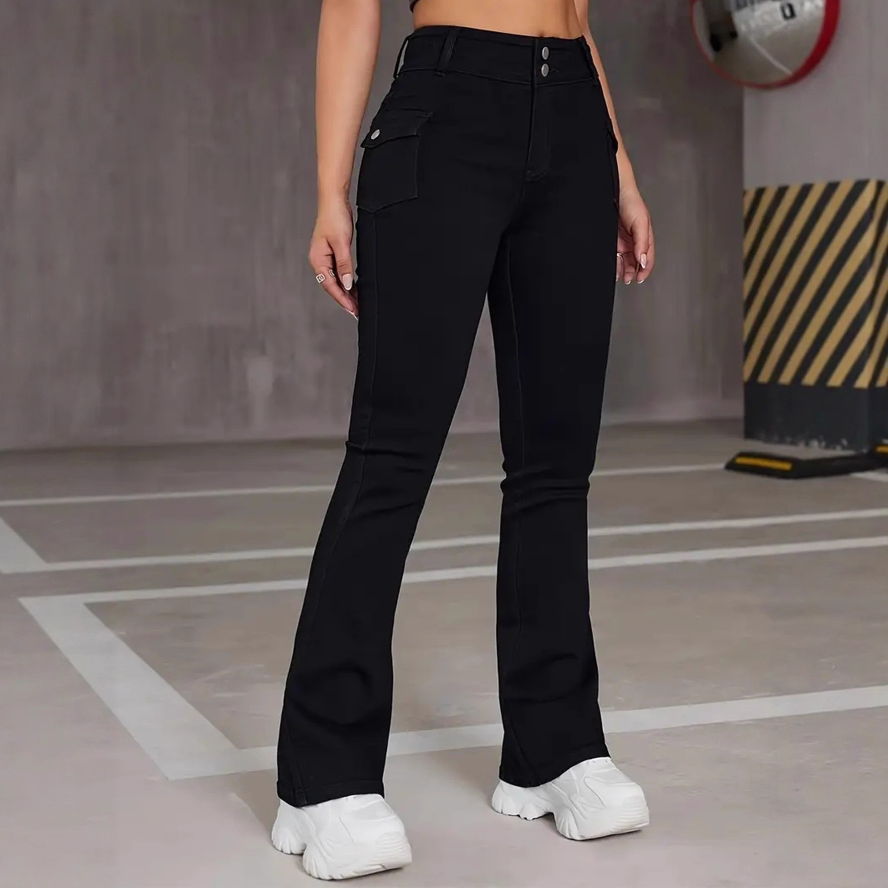 跨境黑色低腰牛仔裤多口袋女裤显瘦工艺长裤喇叭弹力JEANS独立站