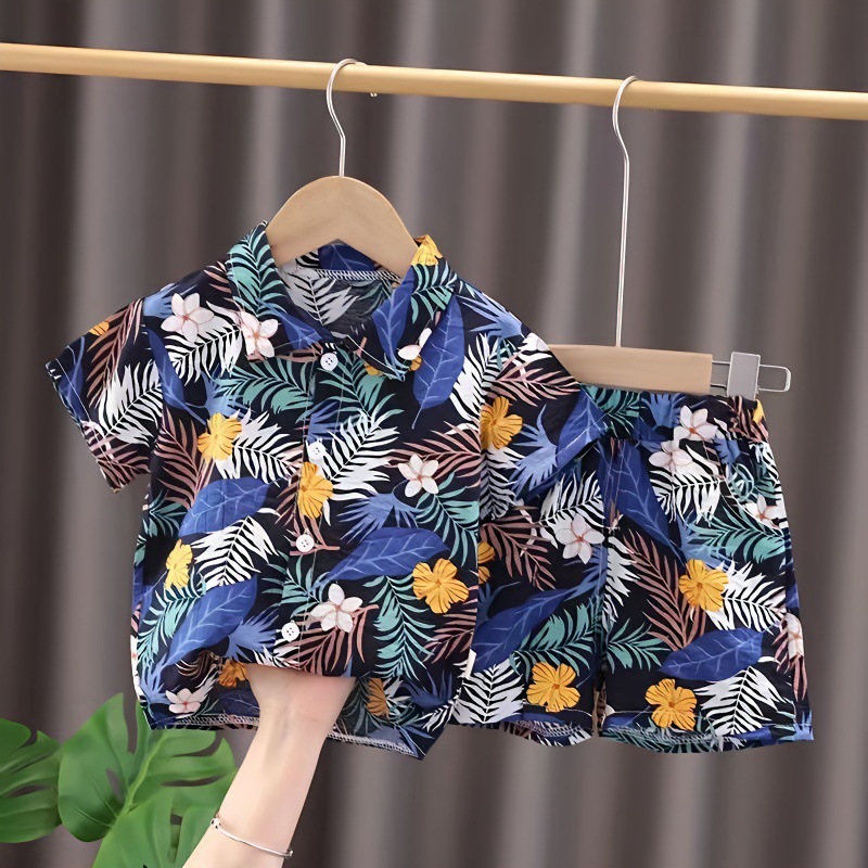 ビーチウェアボーイズサマー半袖スーツ 2023 新しいビーチフラワーシャツスーツ子供ビーチ薄いツーピースホット