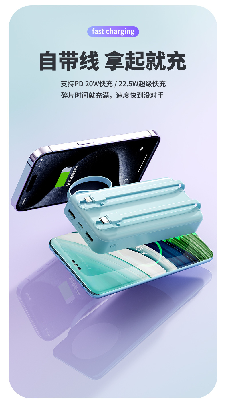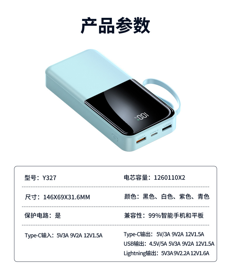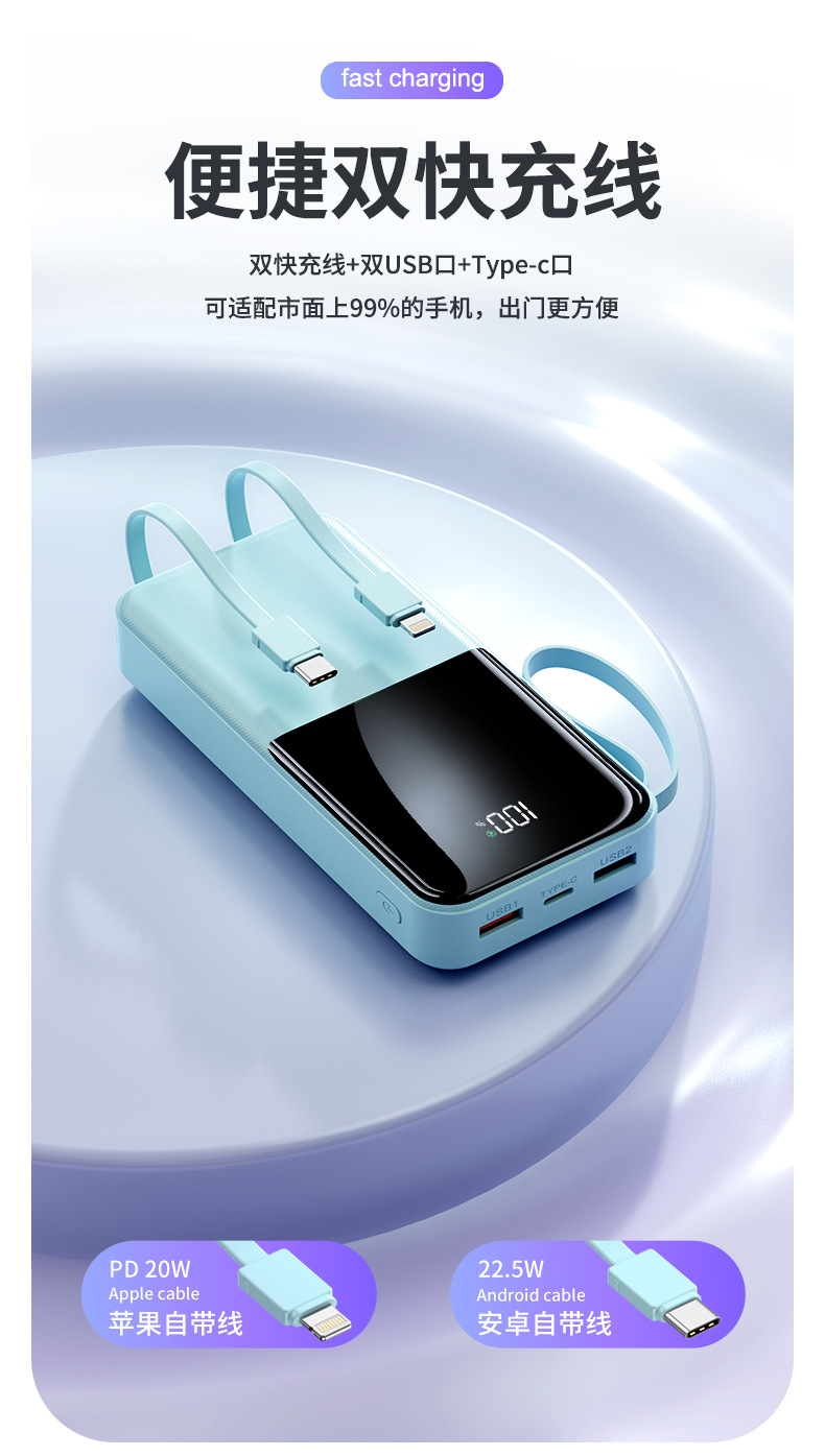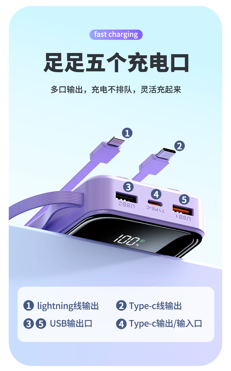 简介:自带TYPE-C线快充输出苹果线2.1A输出颜色:经典黑优雅白绿色紫色