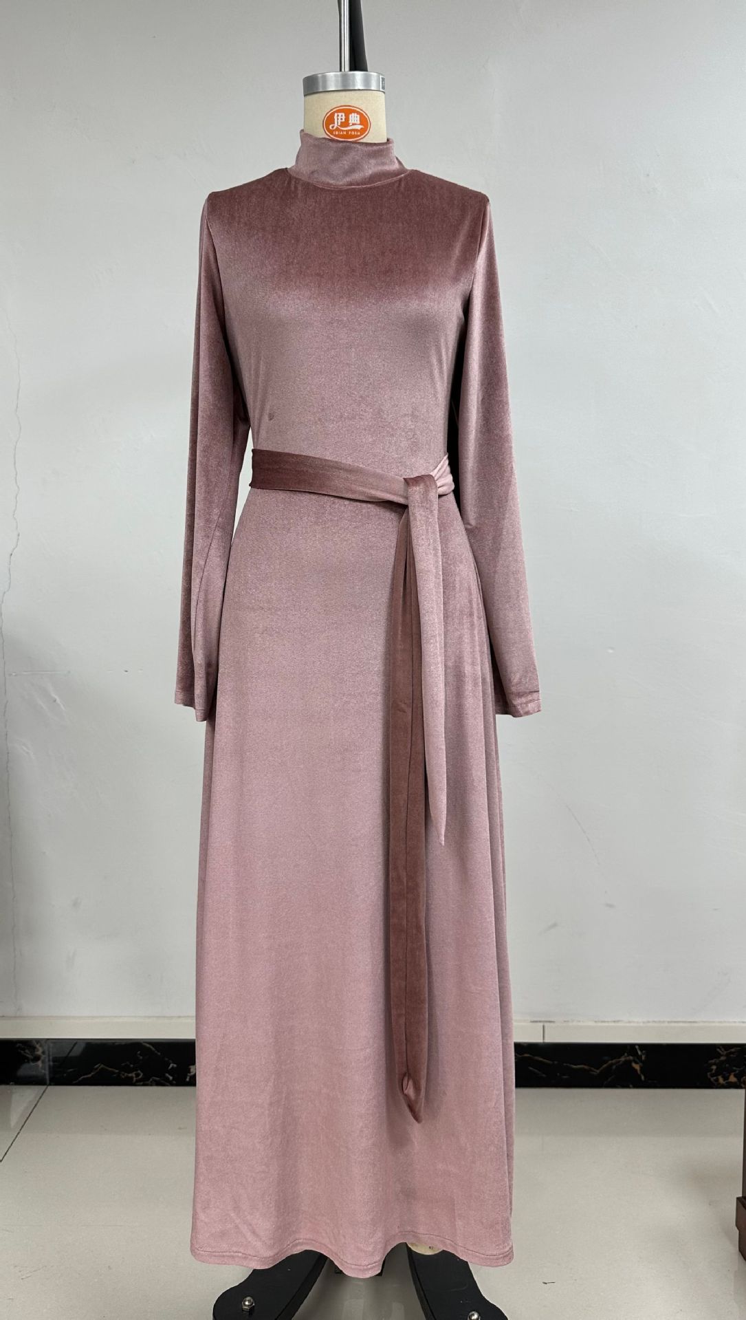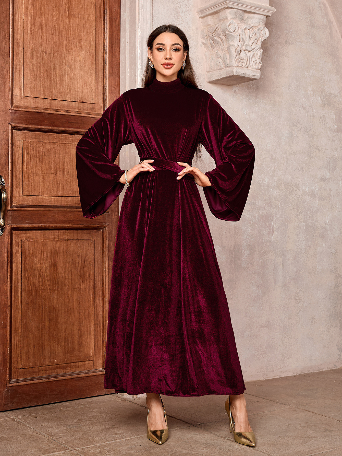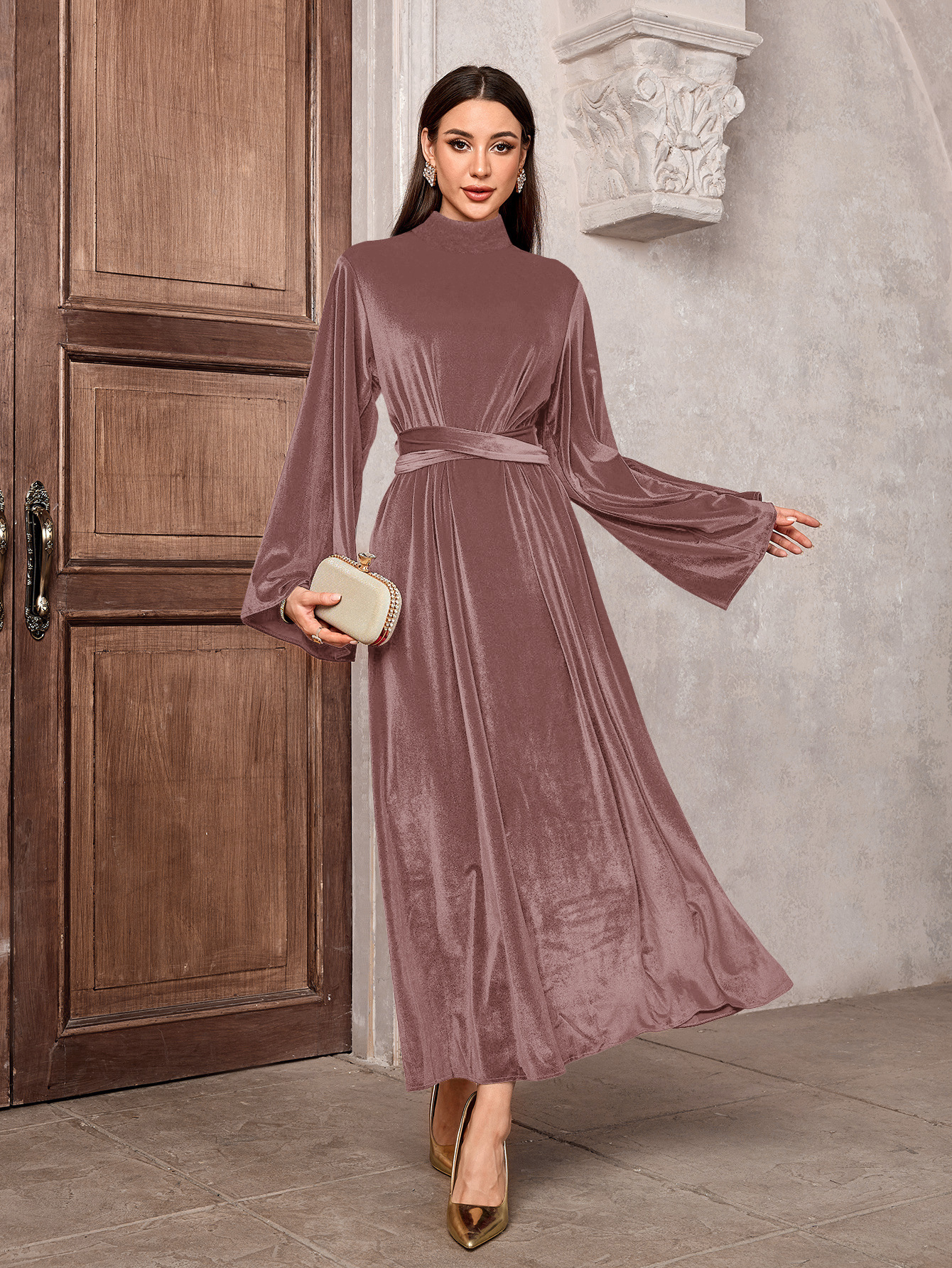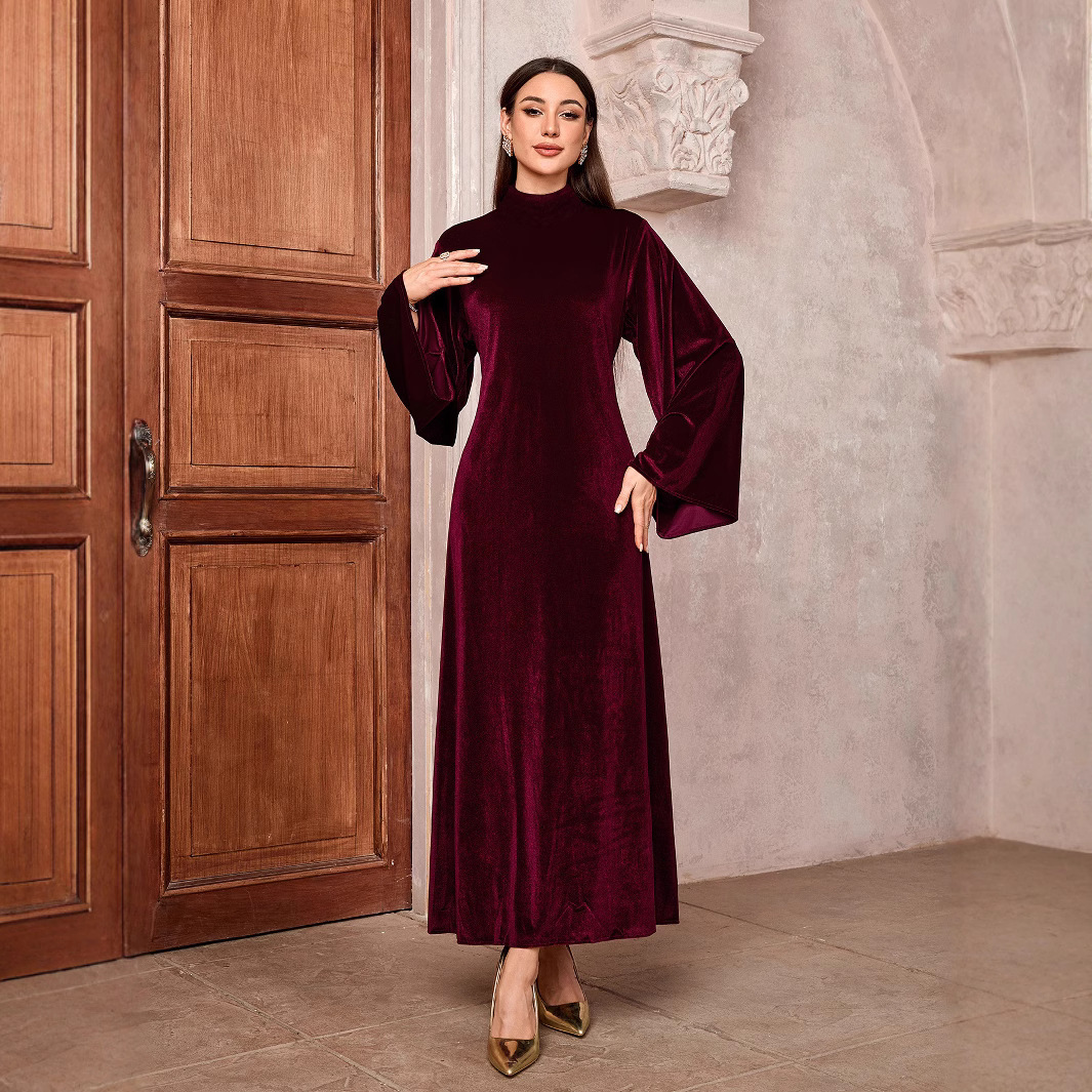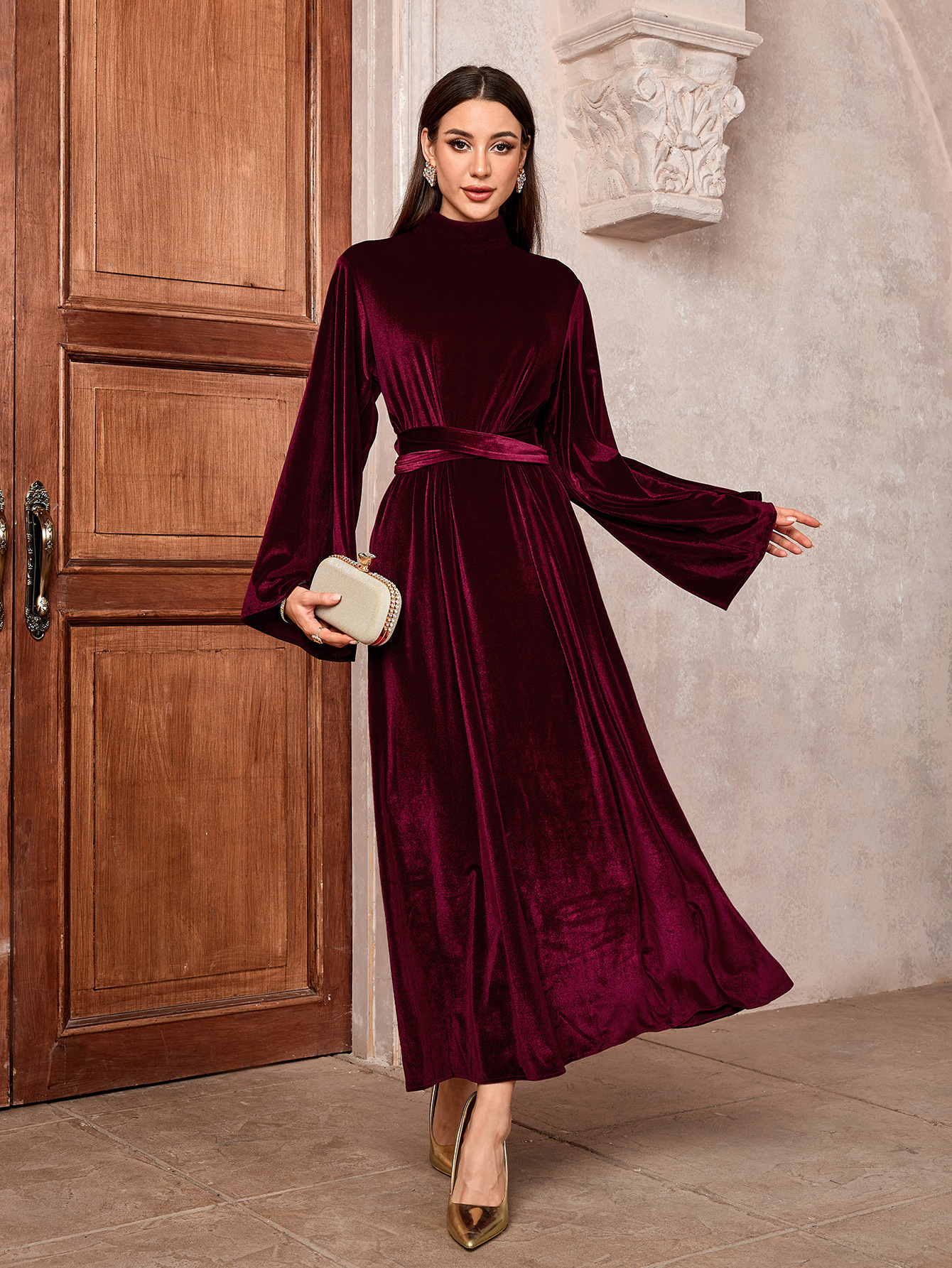 2025新型春秋中東ムスリムアラブ金ベルベットワンピースラッパ袖ベルトファスナー気質