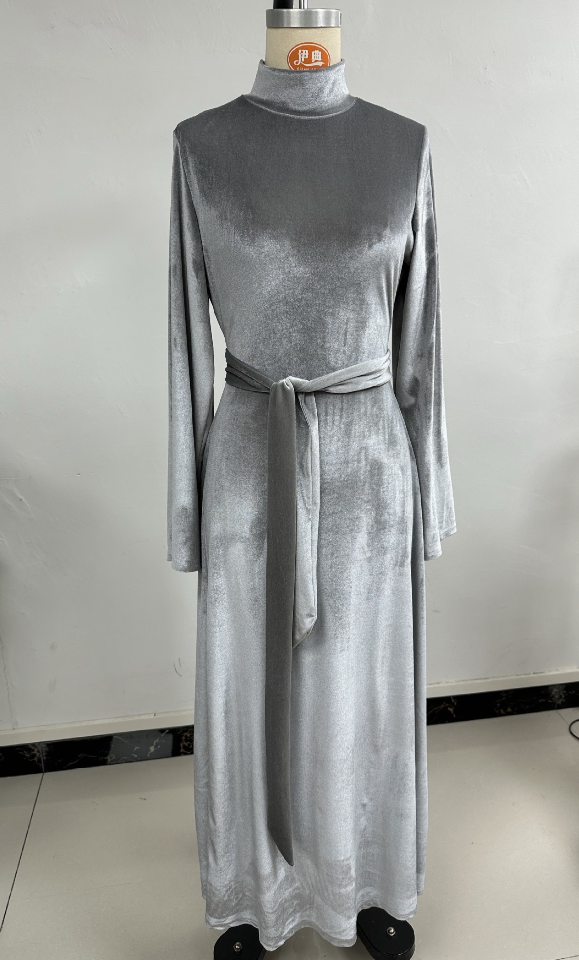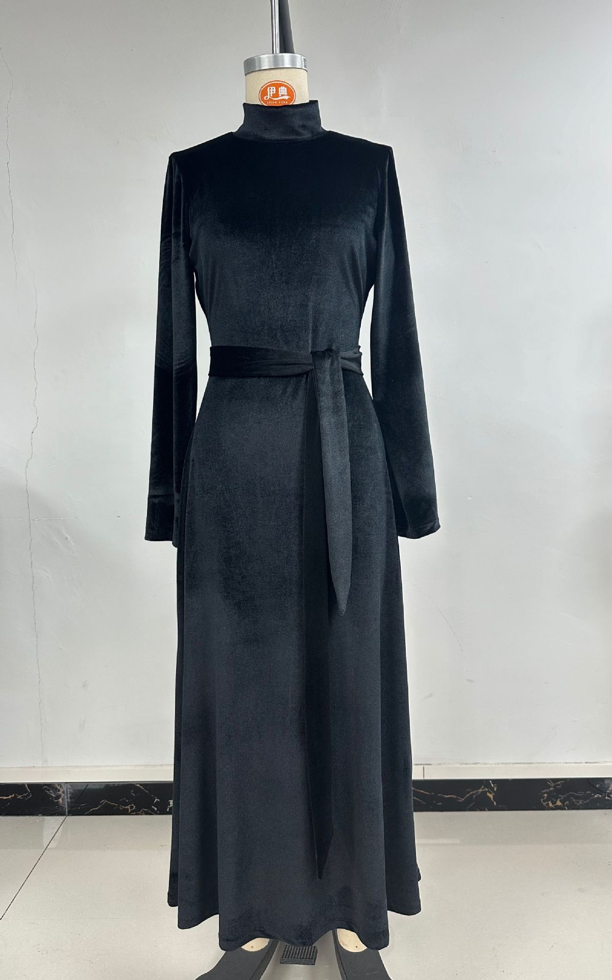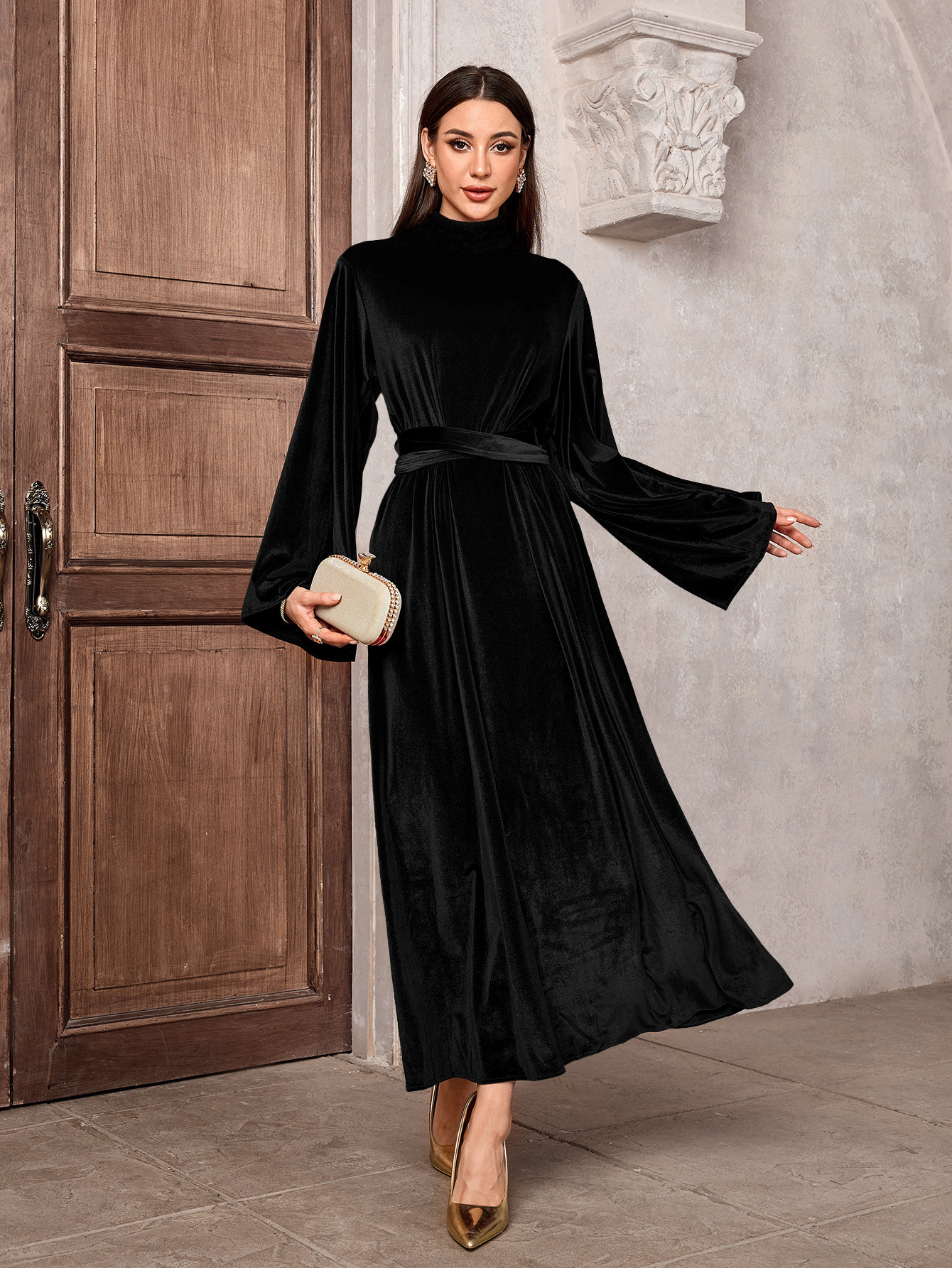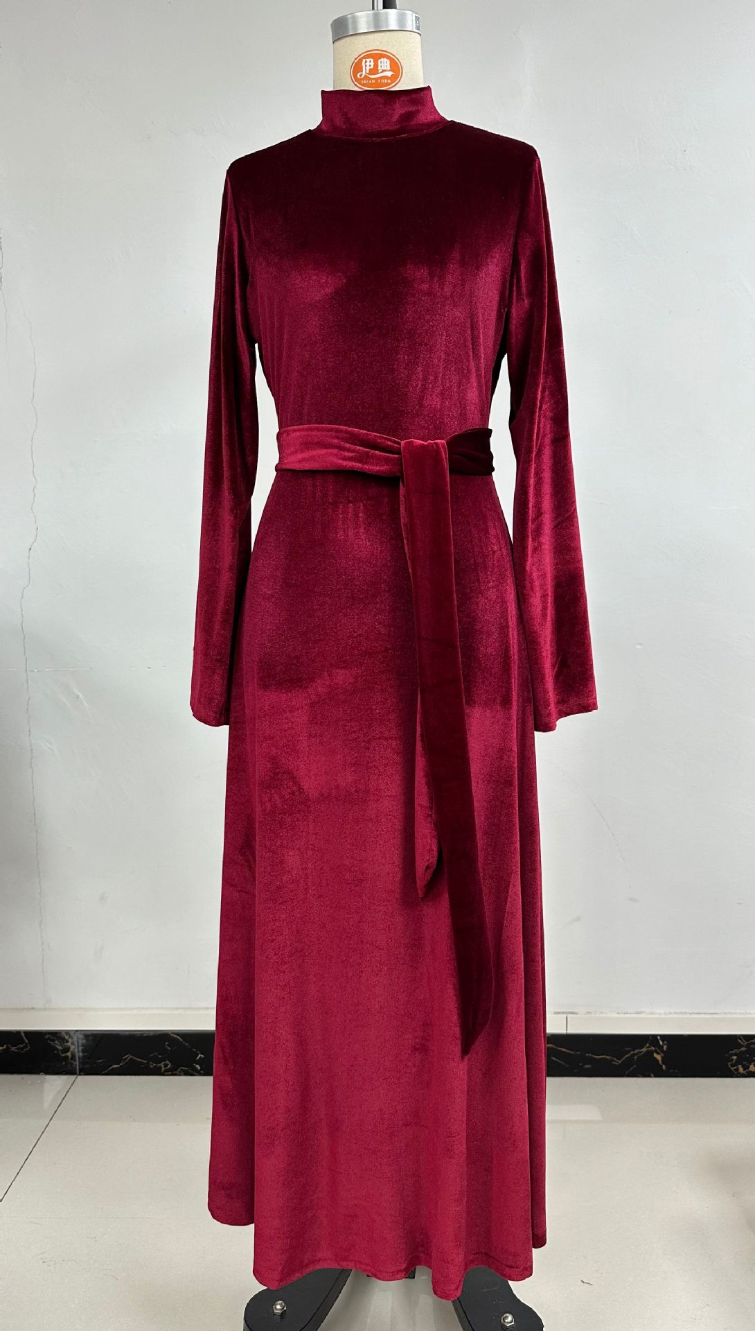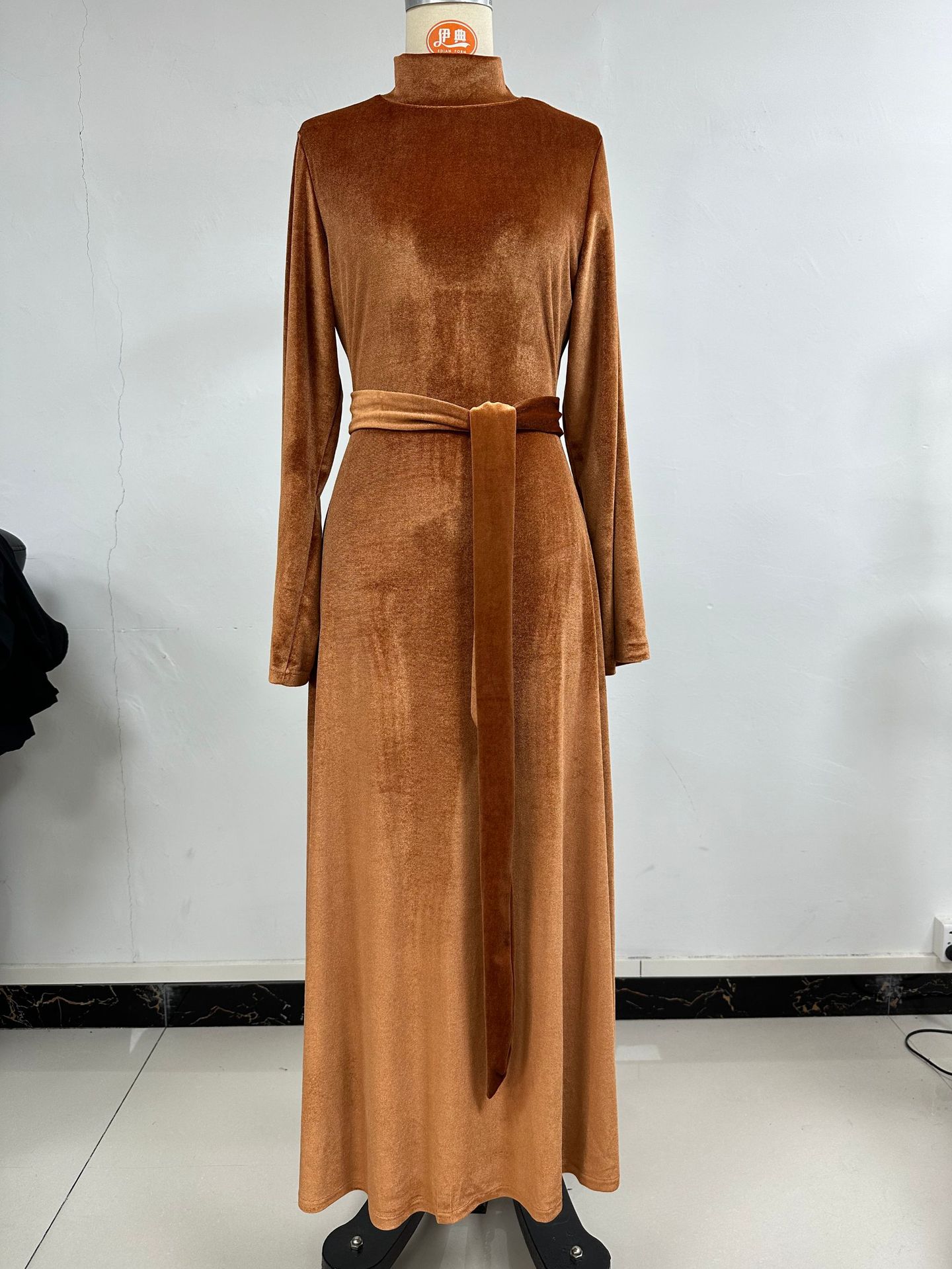 2025新型春秋中東ムスリムアラブ金ベルベットワンピースラッパ袖ベルトファスナー気質