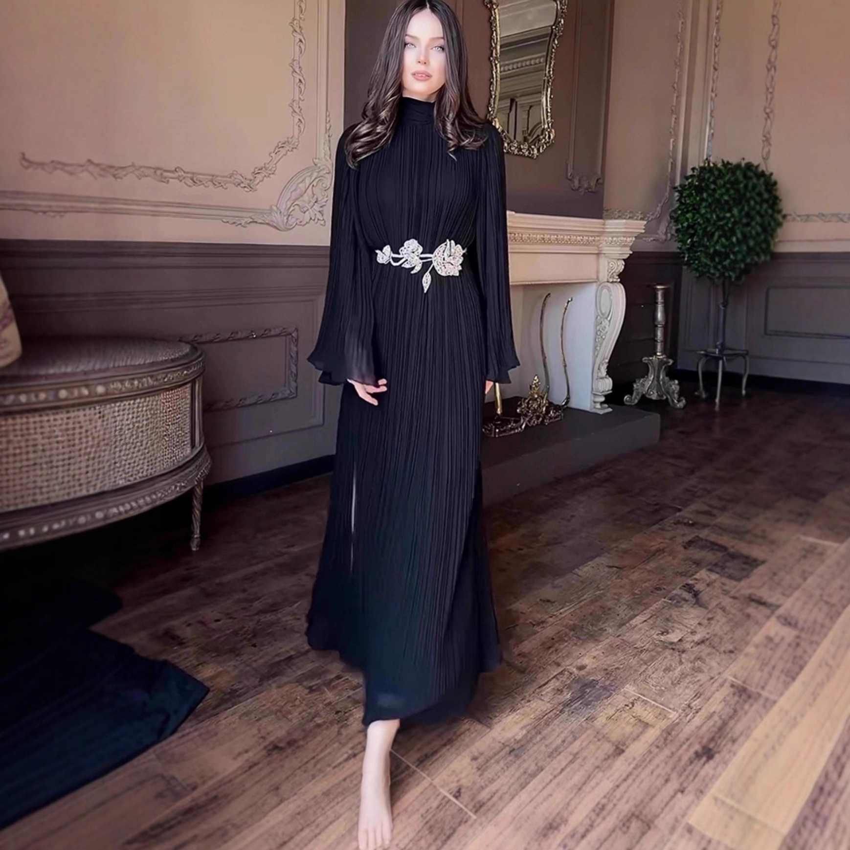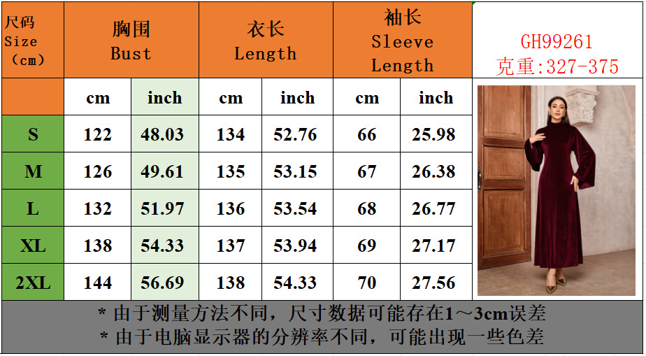 2025新型春秋中東ムスリムサウジアラビア金ベルベットワンピースラッパ袖ベルトファスナーライニング