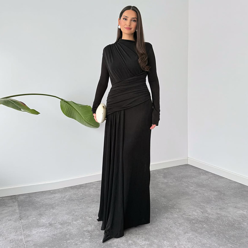 2025年秋新款欧美亚马逊跨境外贸女装圆领不规则褶皱黑色连衣长裙