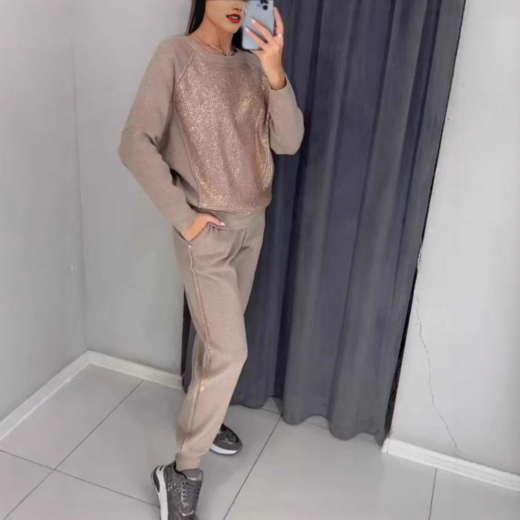 2024欧米の爆発金アマゾン春秋ファッションカジュアル純色ホットドリル長袖丸首スポーツスーツ女装