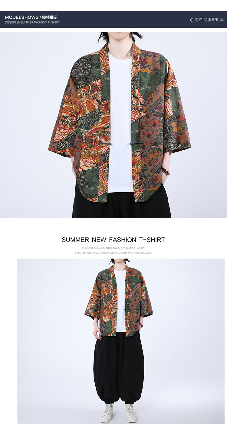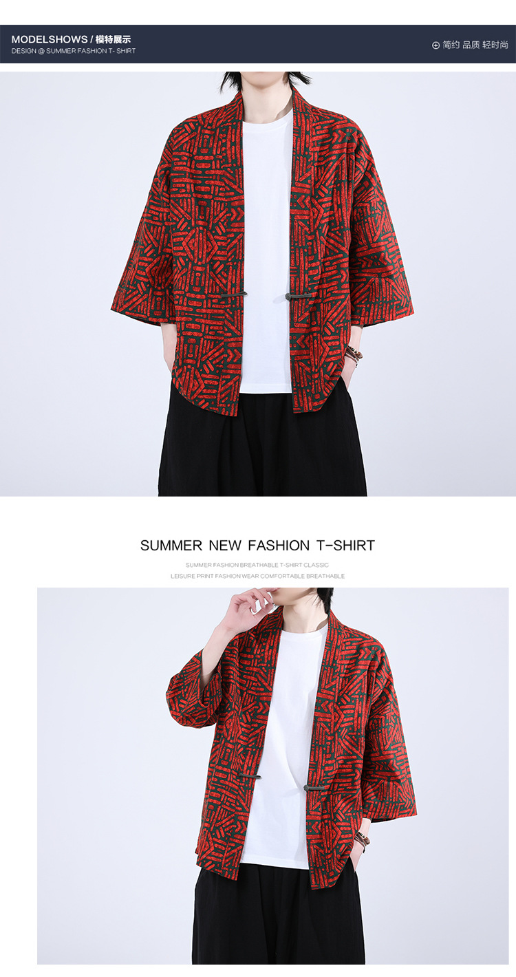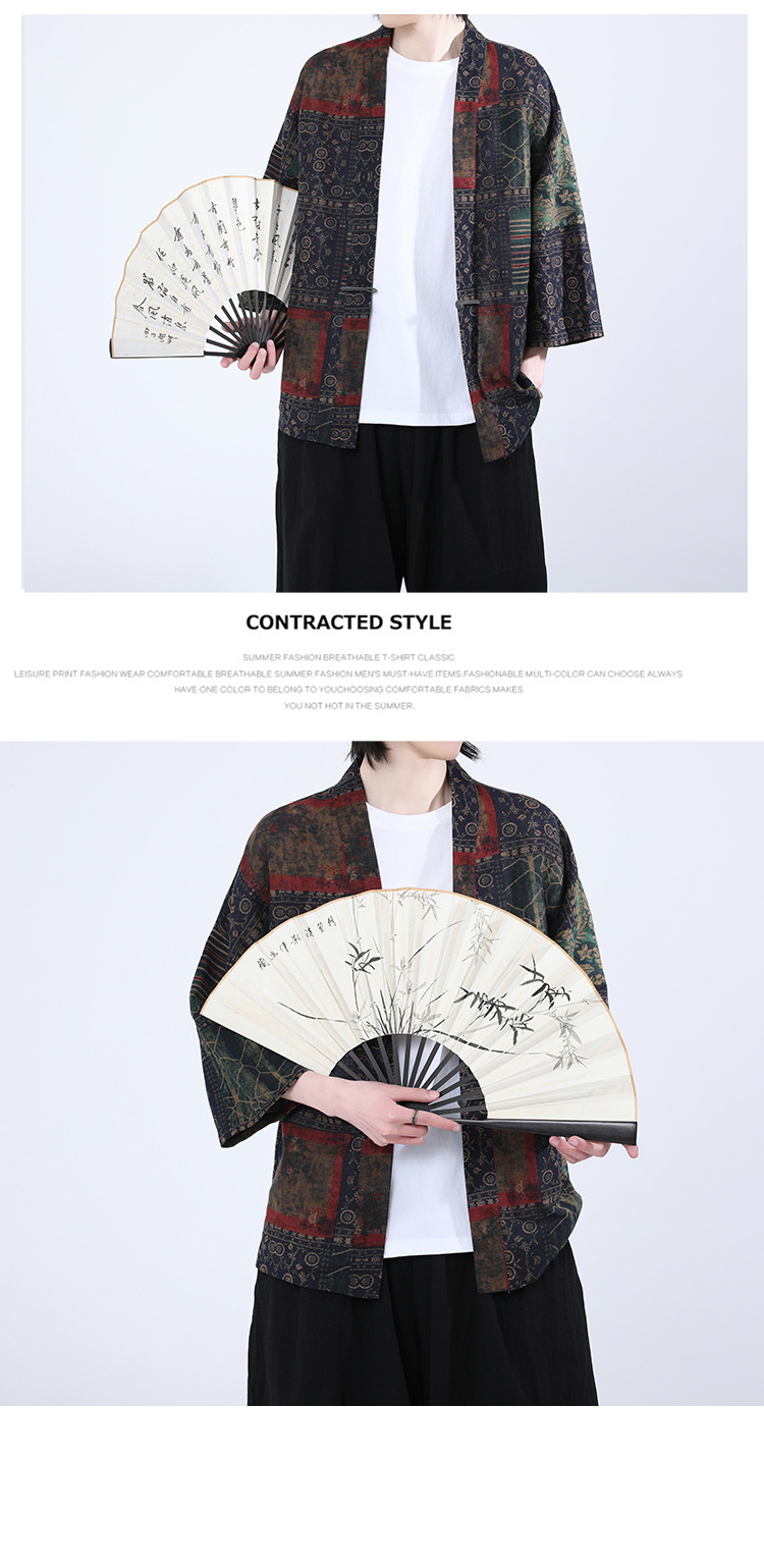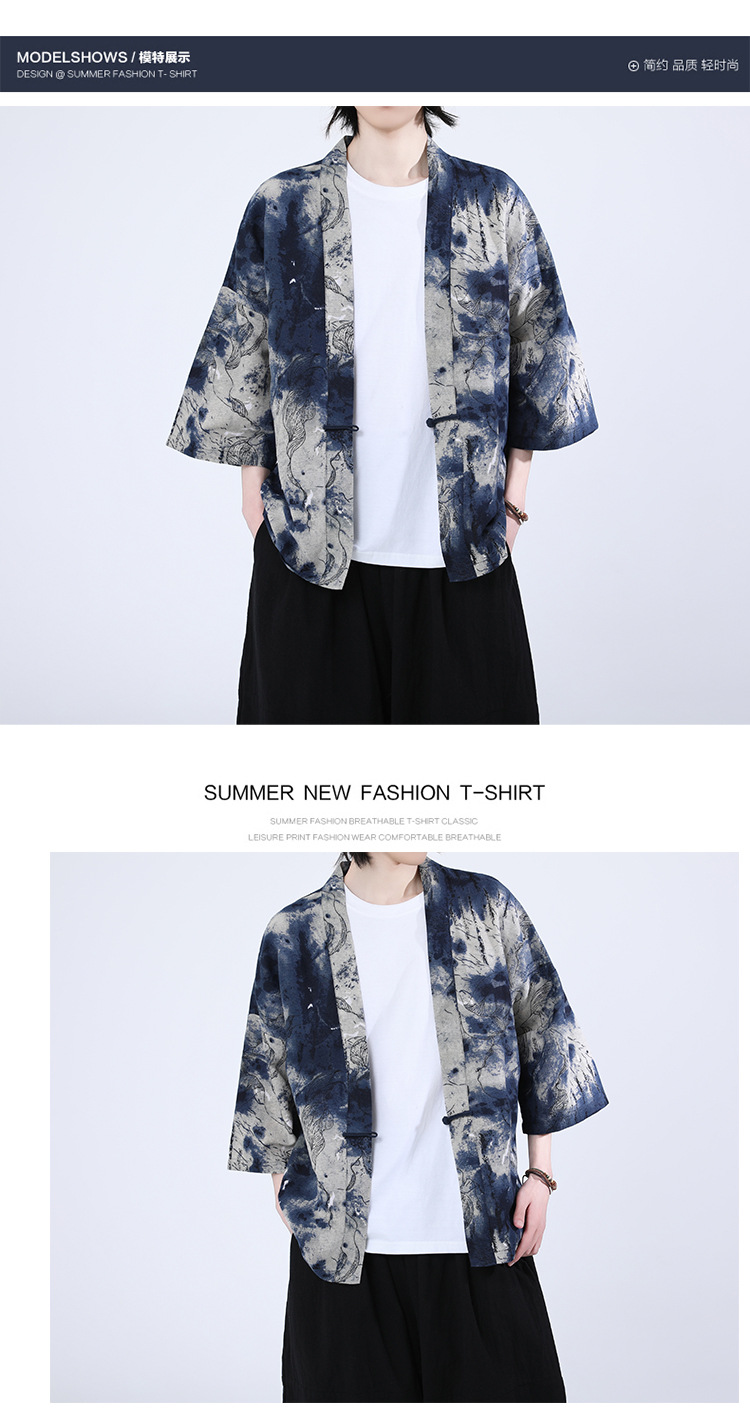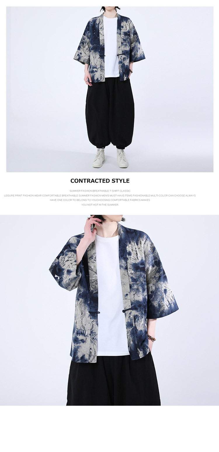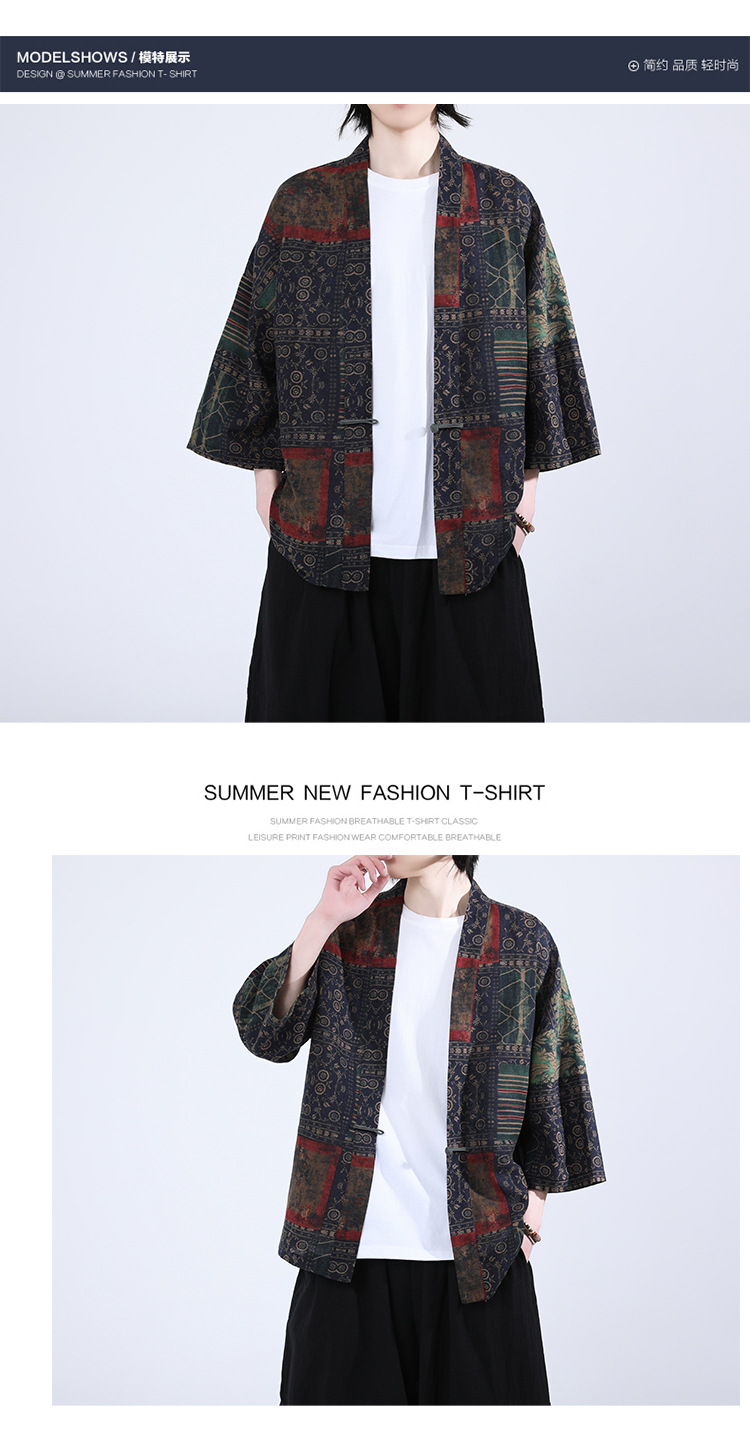 夏の男性用日焼け止め漢服、レトロな中国風カーディガン、プリント入り唐装トップス、男性用ゆったりとした盤扣付き道服ジャケット