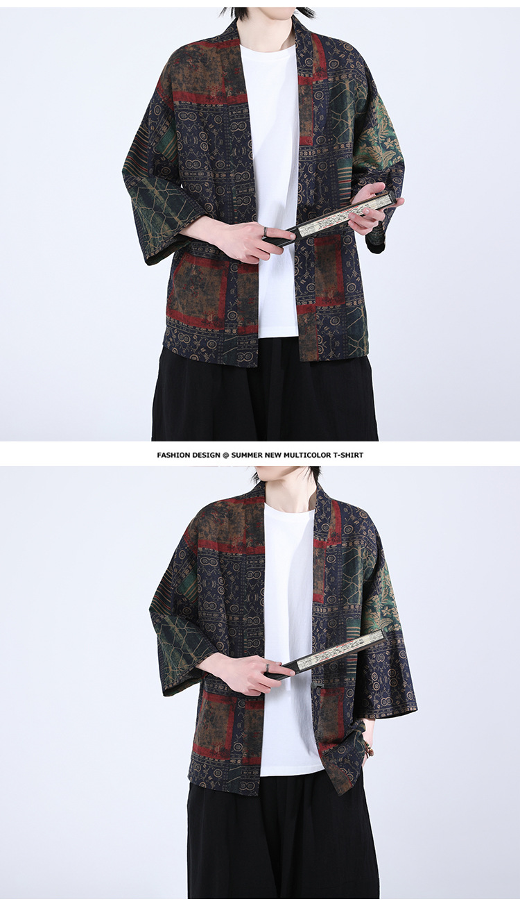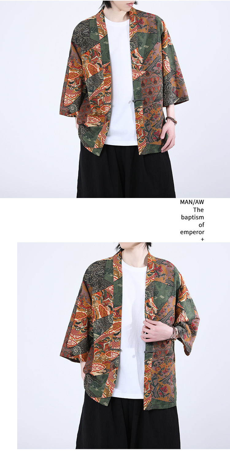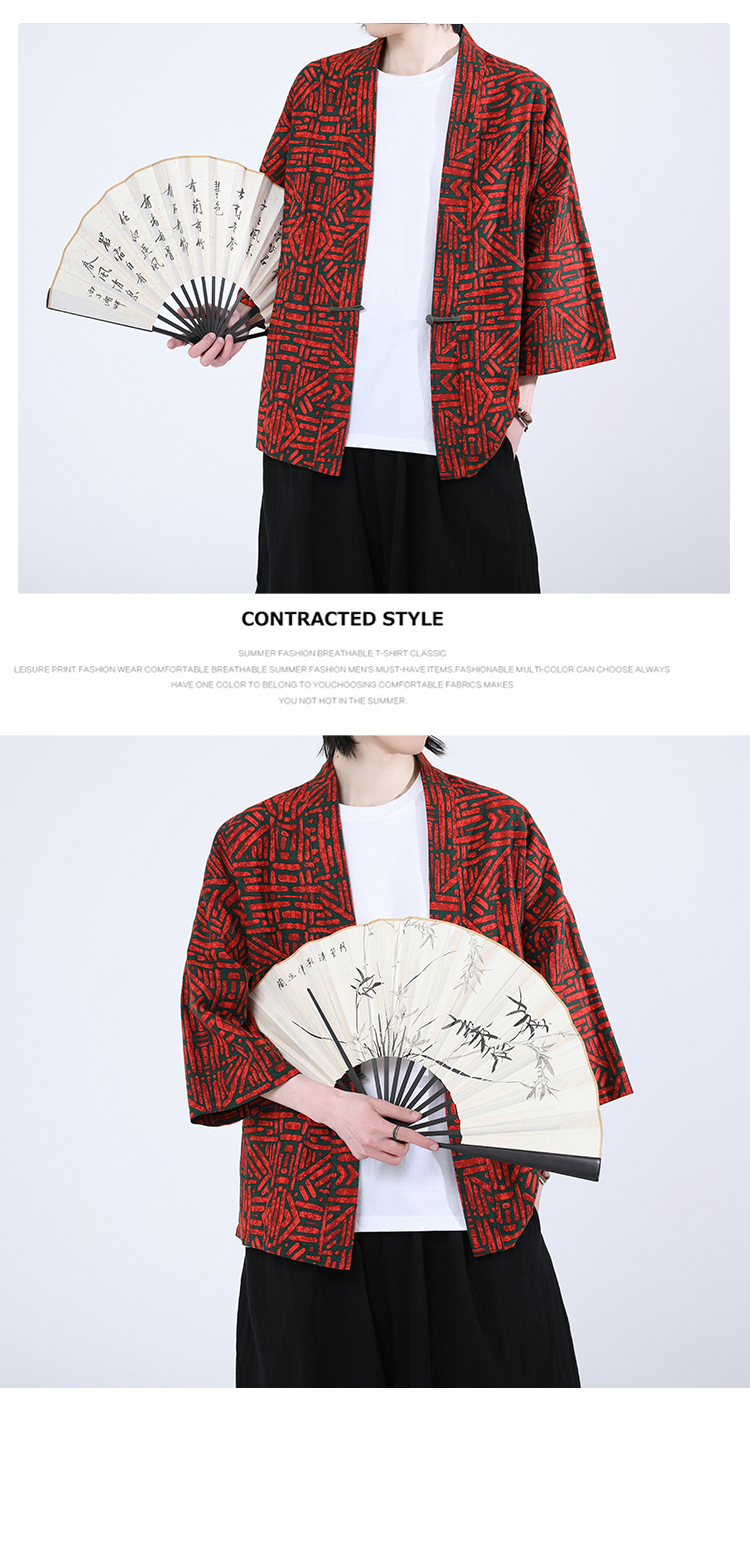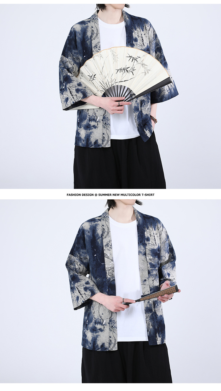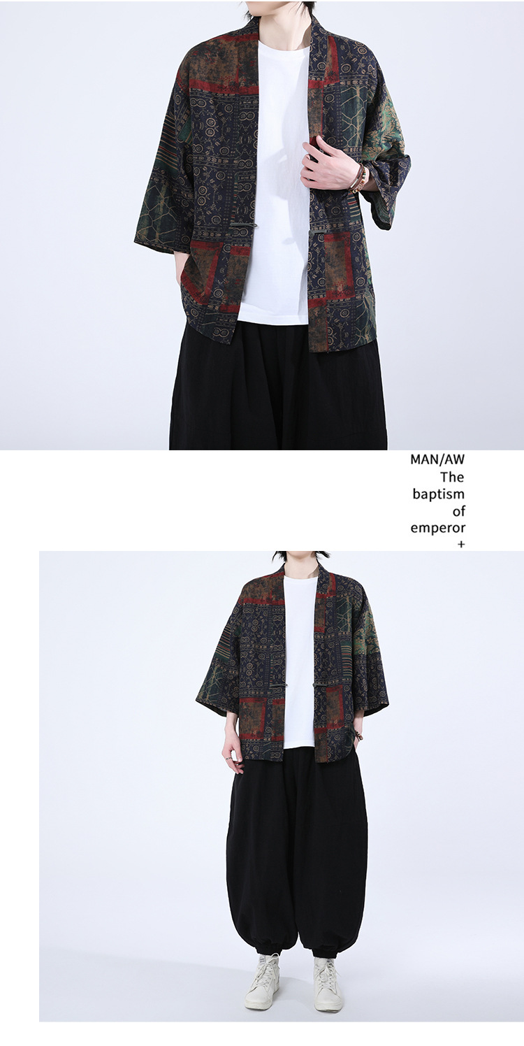 夏の男性用日焼け止め漢服、レトロな中国風カーディガン、プリント入り唐装トップス、男性用ゆったりとした盤扣付き道服ジャケット