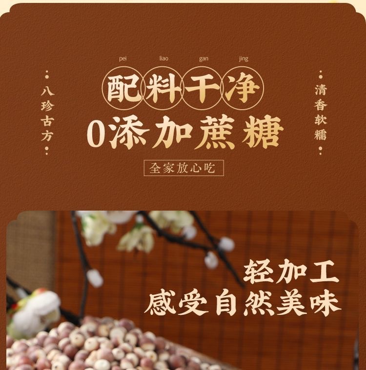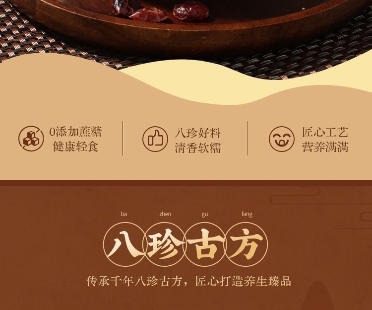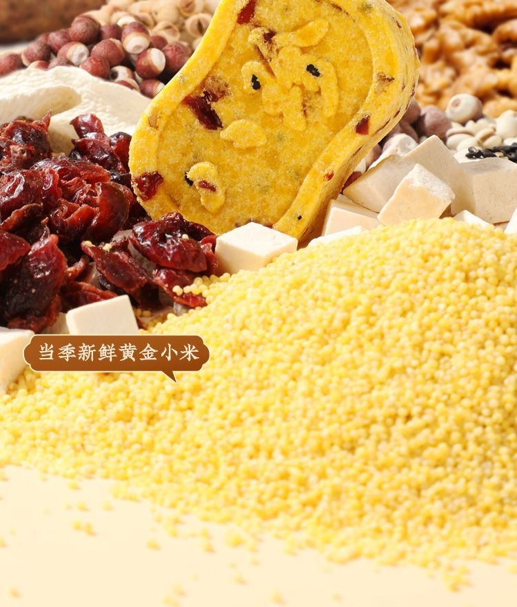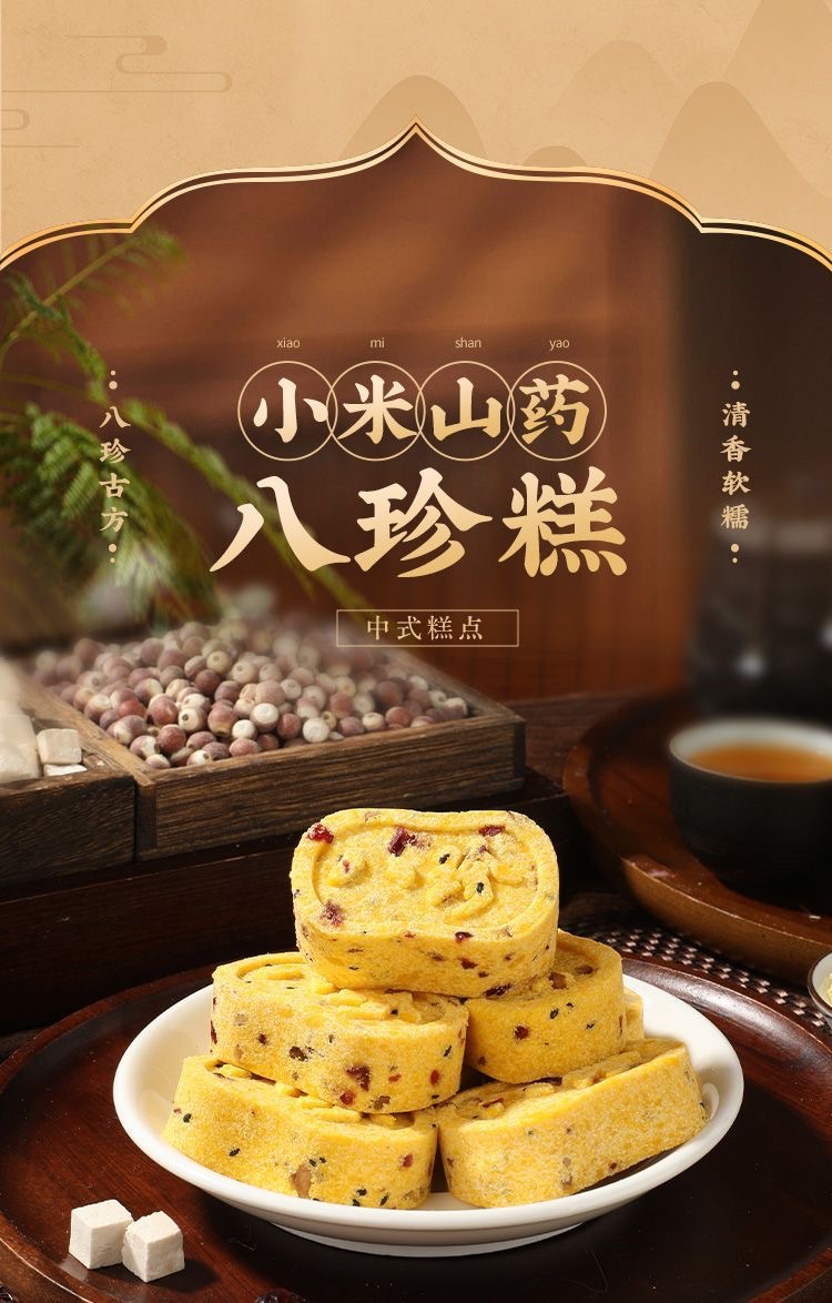 八珍ケーキ、ポリアココナッツ、八珍ケーキ、キビ、ヤムイモ、クランベリー、八珍ケーキ、ナッツ、大麦、ナツメ、ショ糖不使用