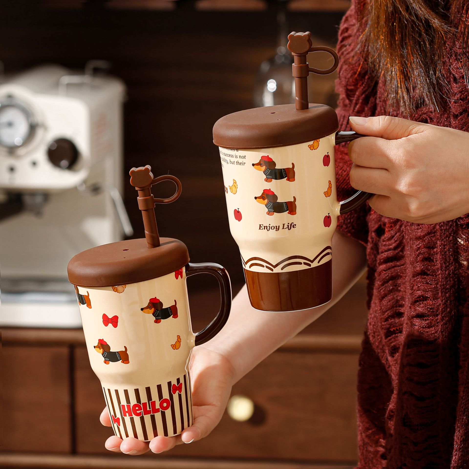 蓋付きビッグマック漫画かわいい子犬陶磁器カップ高颜値大容量ストローカップ波点マグカッププレゼント