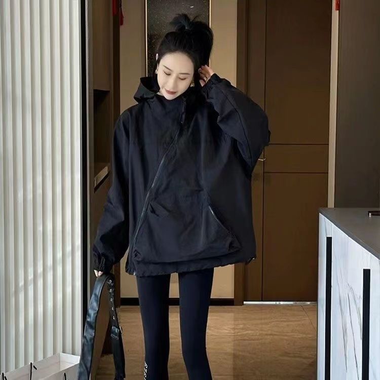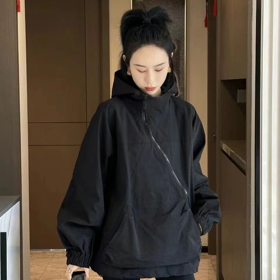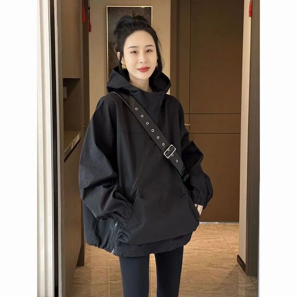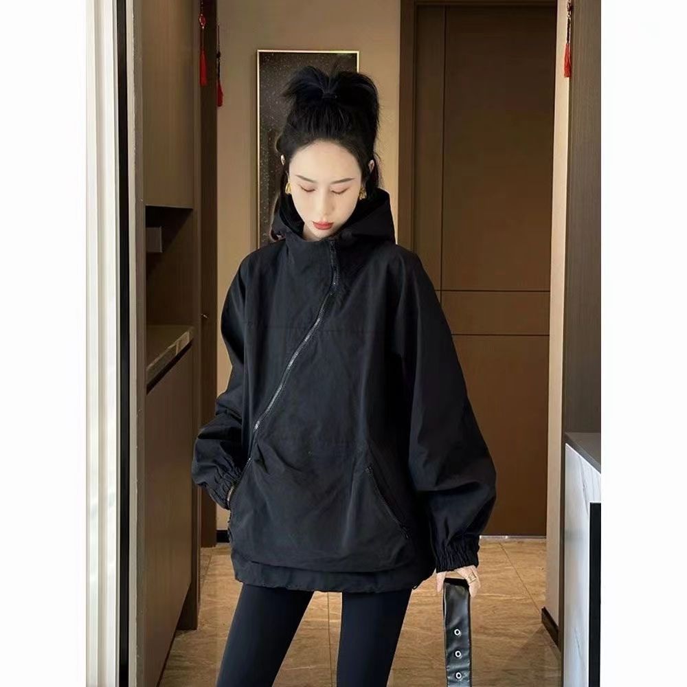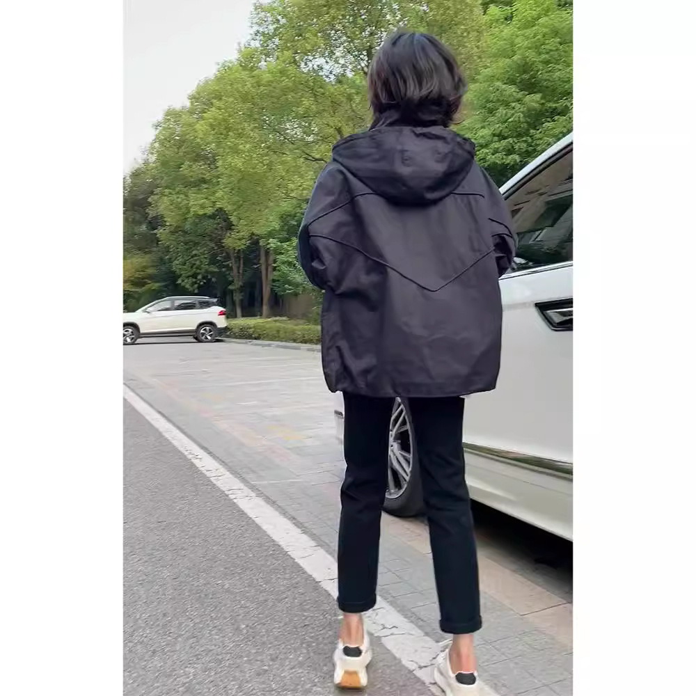 2025新款秋季女士休闲上衣黑色连帽冲锋衣夹克外套女潮流