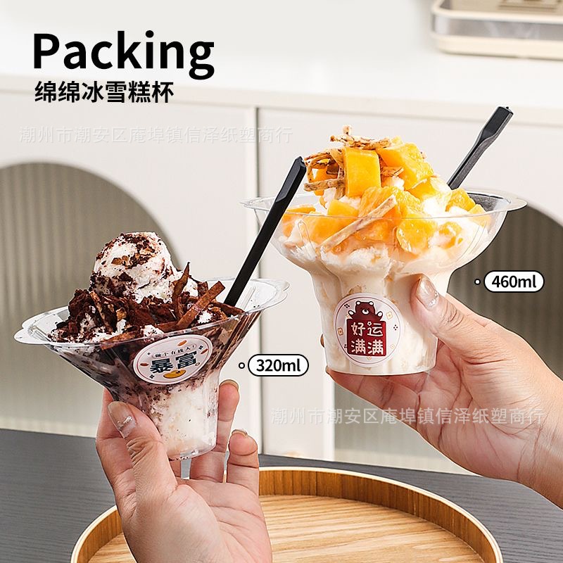 ネット赤芋泥氷包装ボウル使い捨て綿氷かき氷果物すくい専用包装箱手にコップを持っている