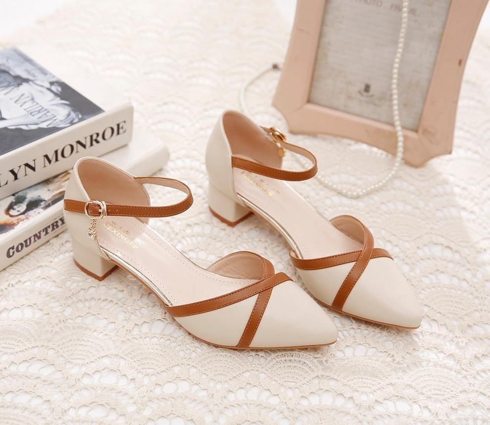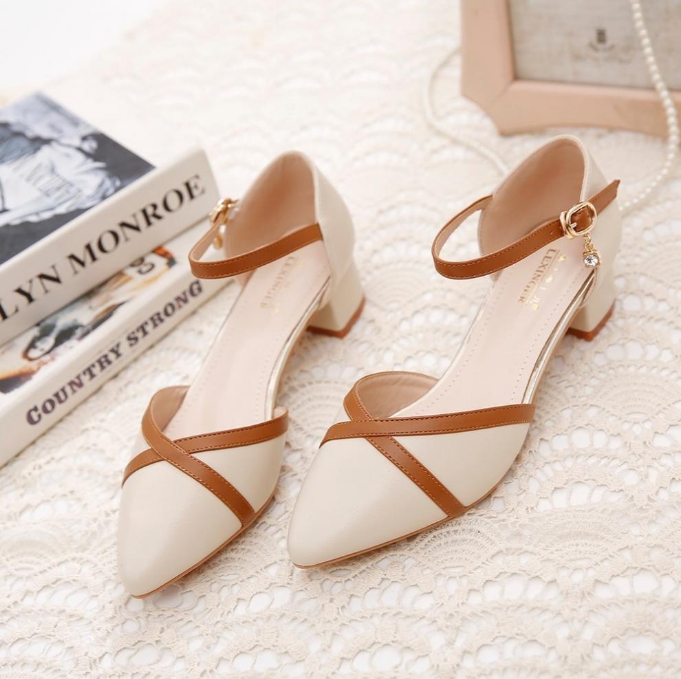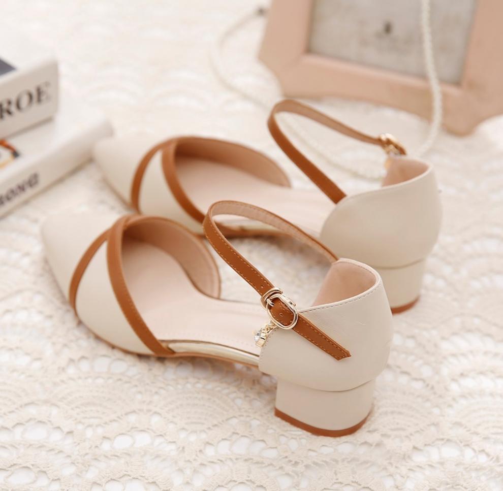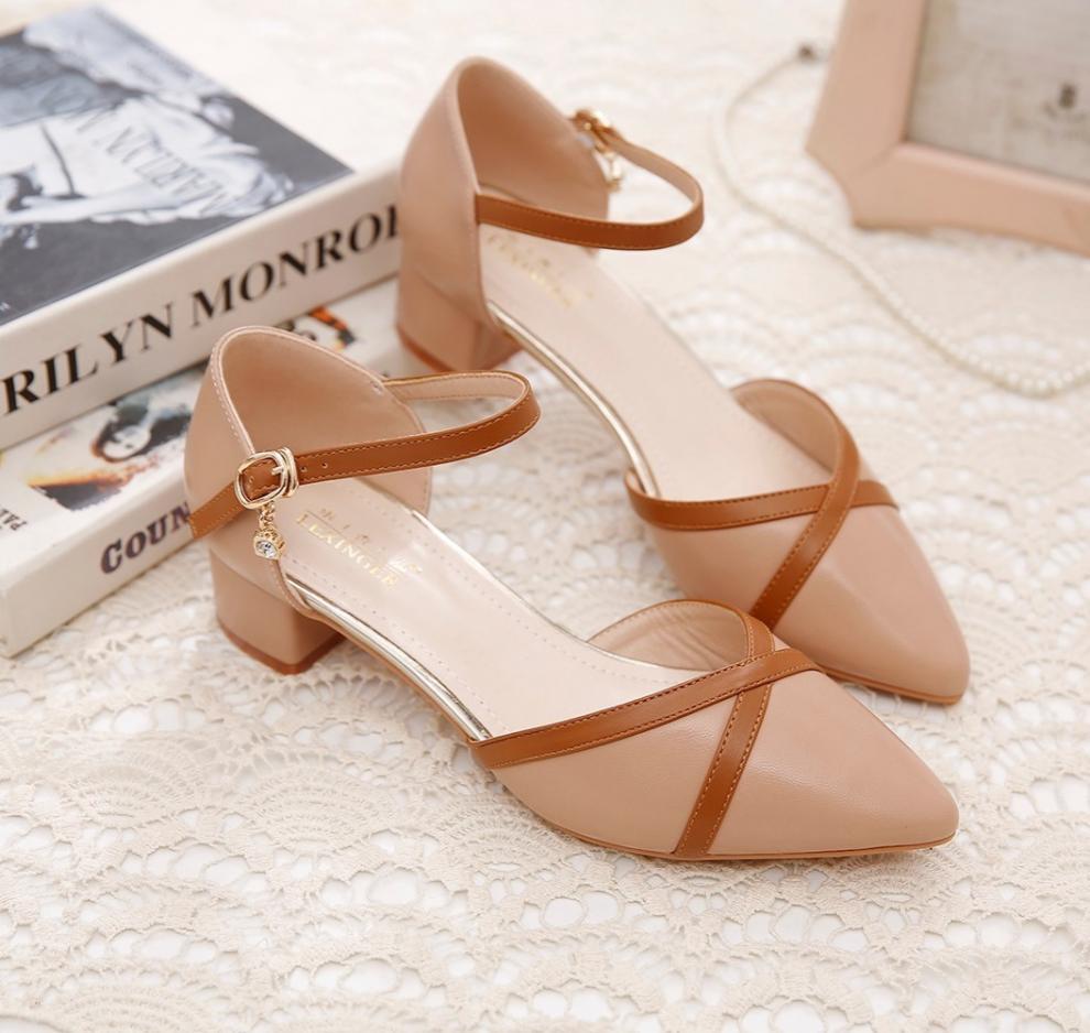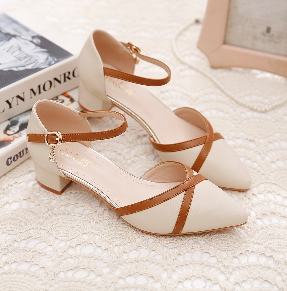 包頭サンダル女性2025新型春夏一字ボタン太ヒール中と百合色の先の仕事靴女性