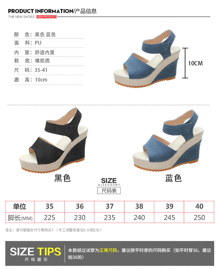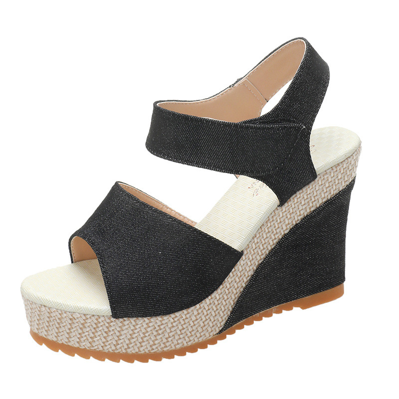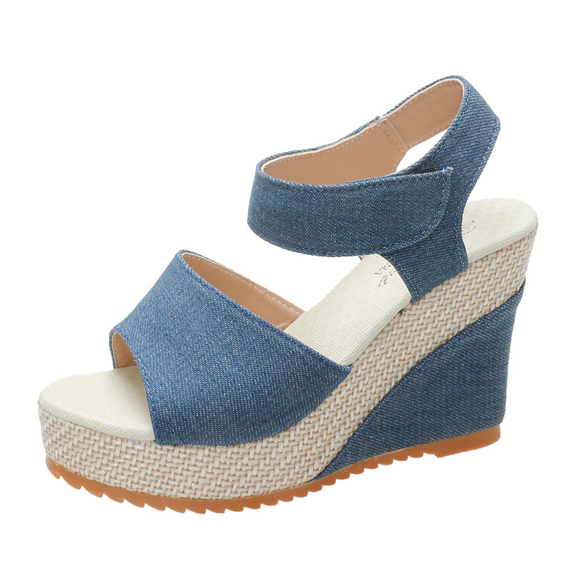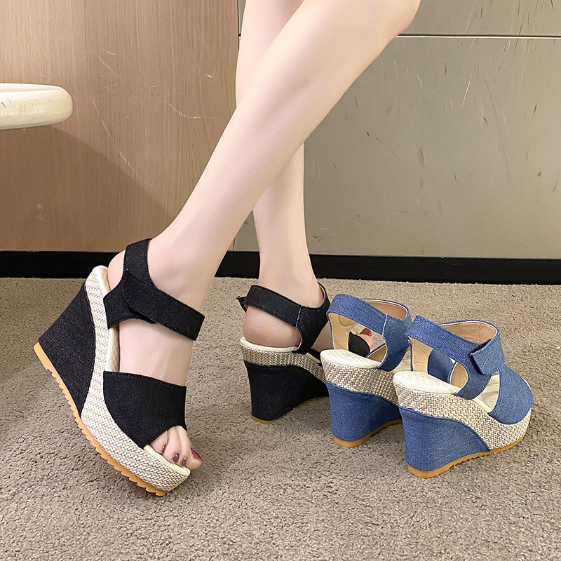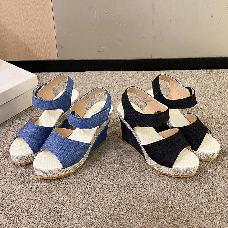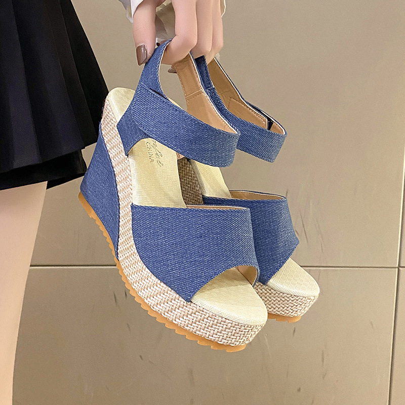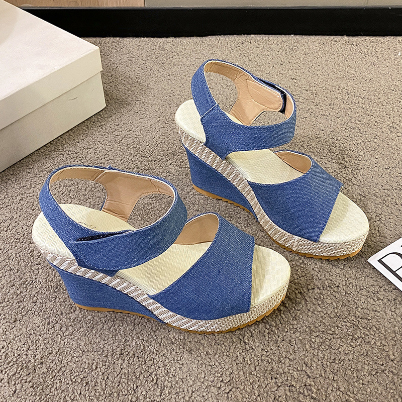2025夏のファッションデニムの新型松餅の女性靴欧米のカジュアルサンダルのマジックの厚い底の坂と女性のサンダル