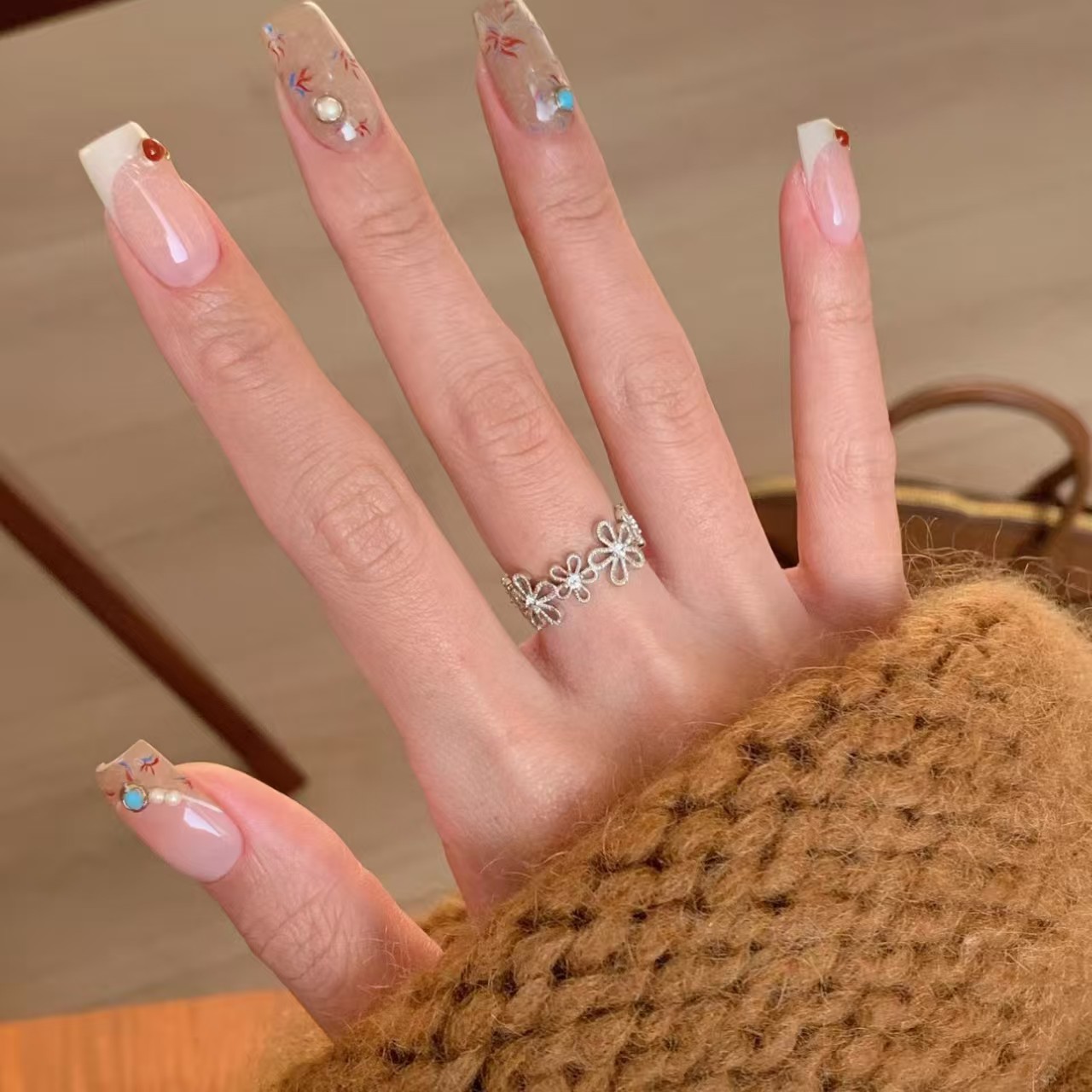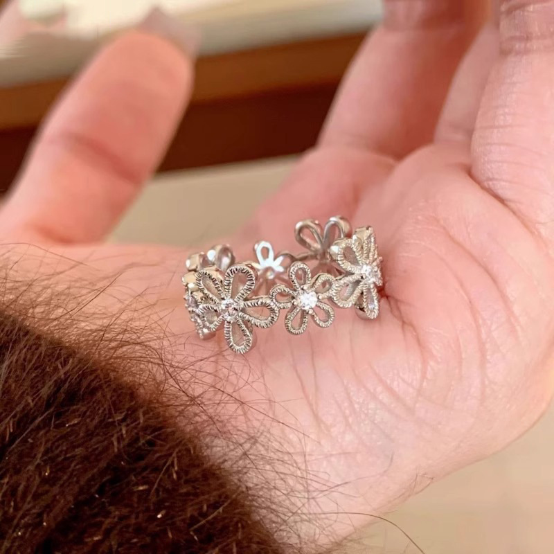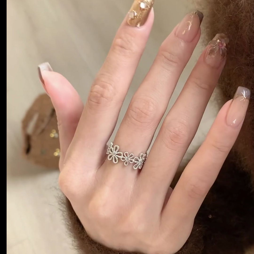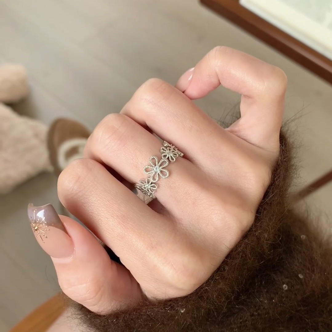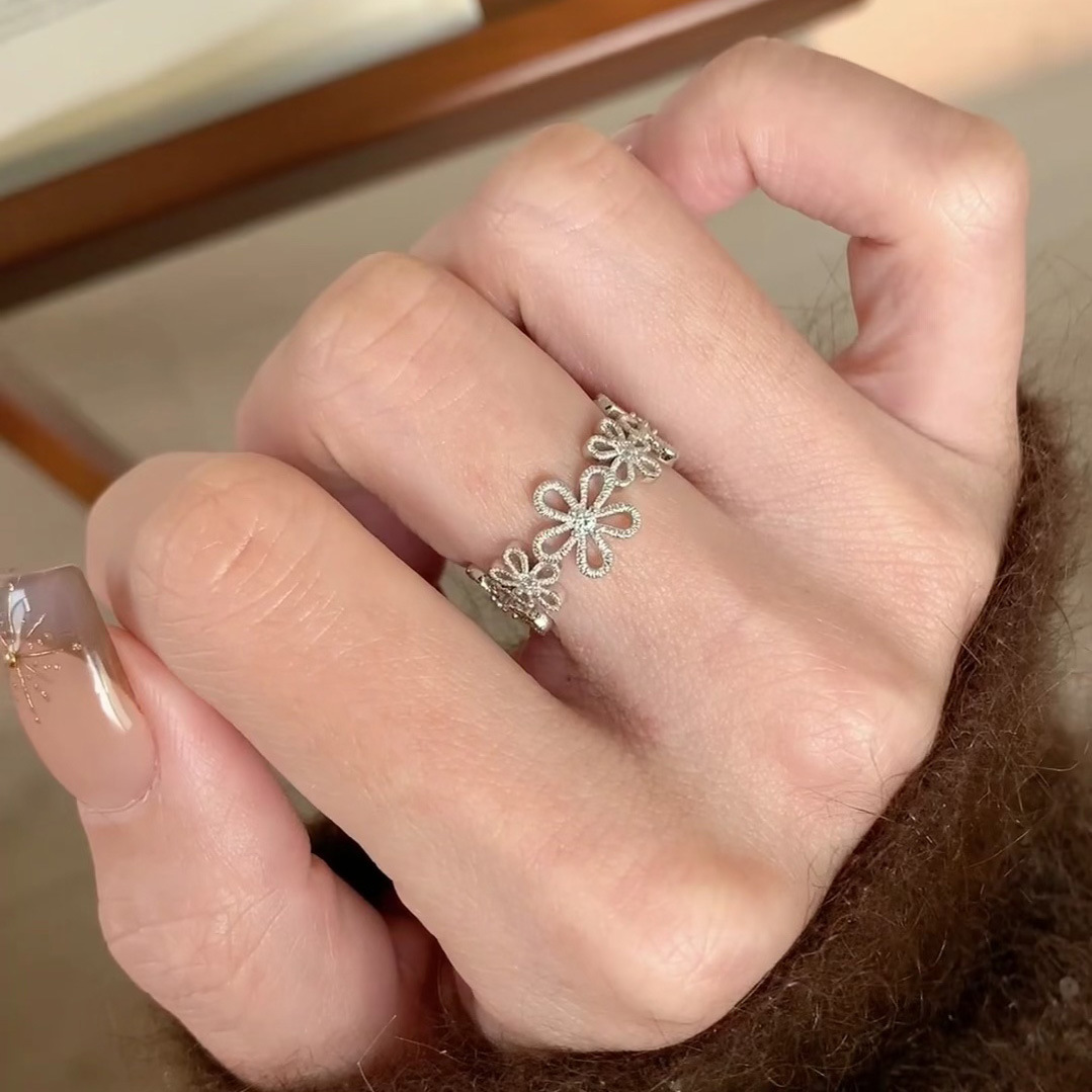 小红书爆款蕾丝花甜美银色花朵闪钻小众轻奢精致百搭高级戒指指环