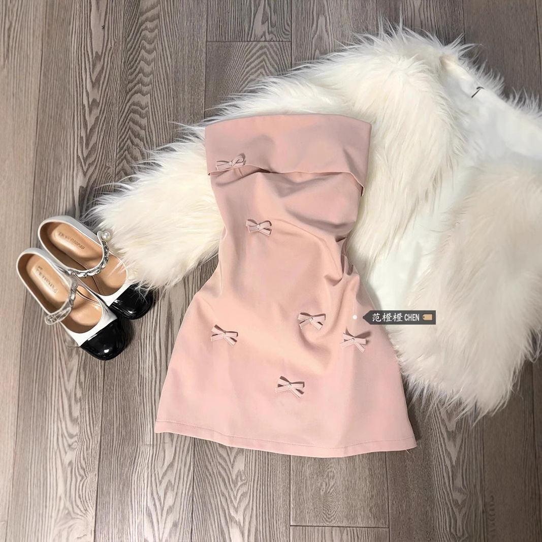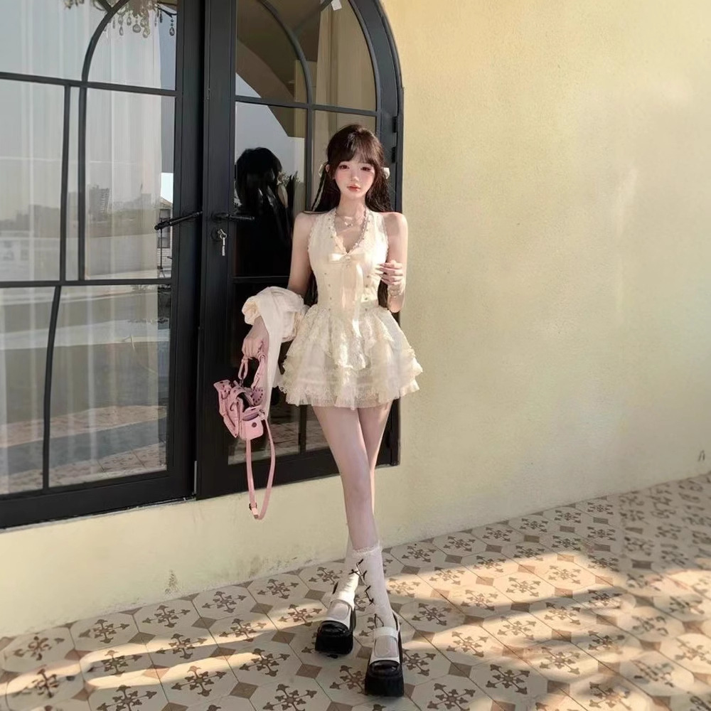 春の新型フランスの小衆は腰の王女を収めて首の杏色のワンピースの杏色のカーディガンのスーツの女性を現像します。