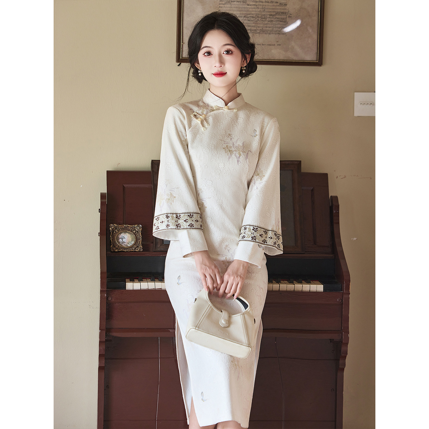 白色长袖旗袍2025年新款秋冬款加绒复古年轻款改良连衣裙女新中式