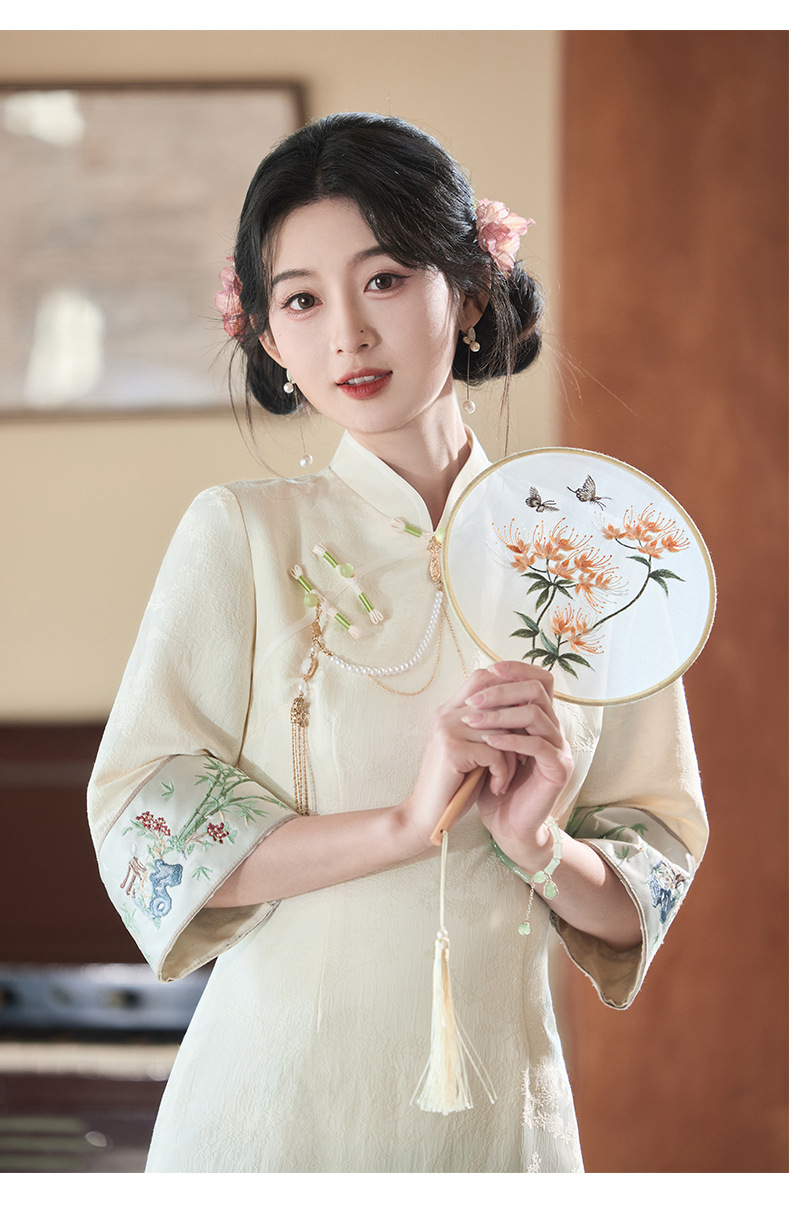 新中国式ベトナムオーデニットチャイナ服改良若いワンピース竹葉禅意茶服秋冬長袖