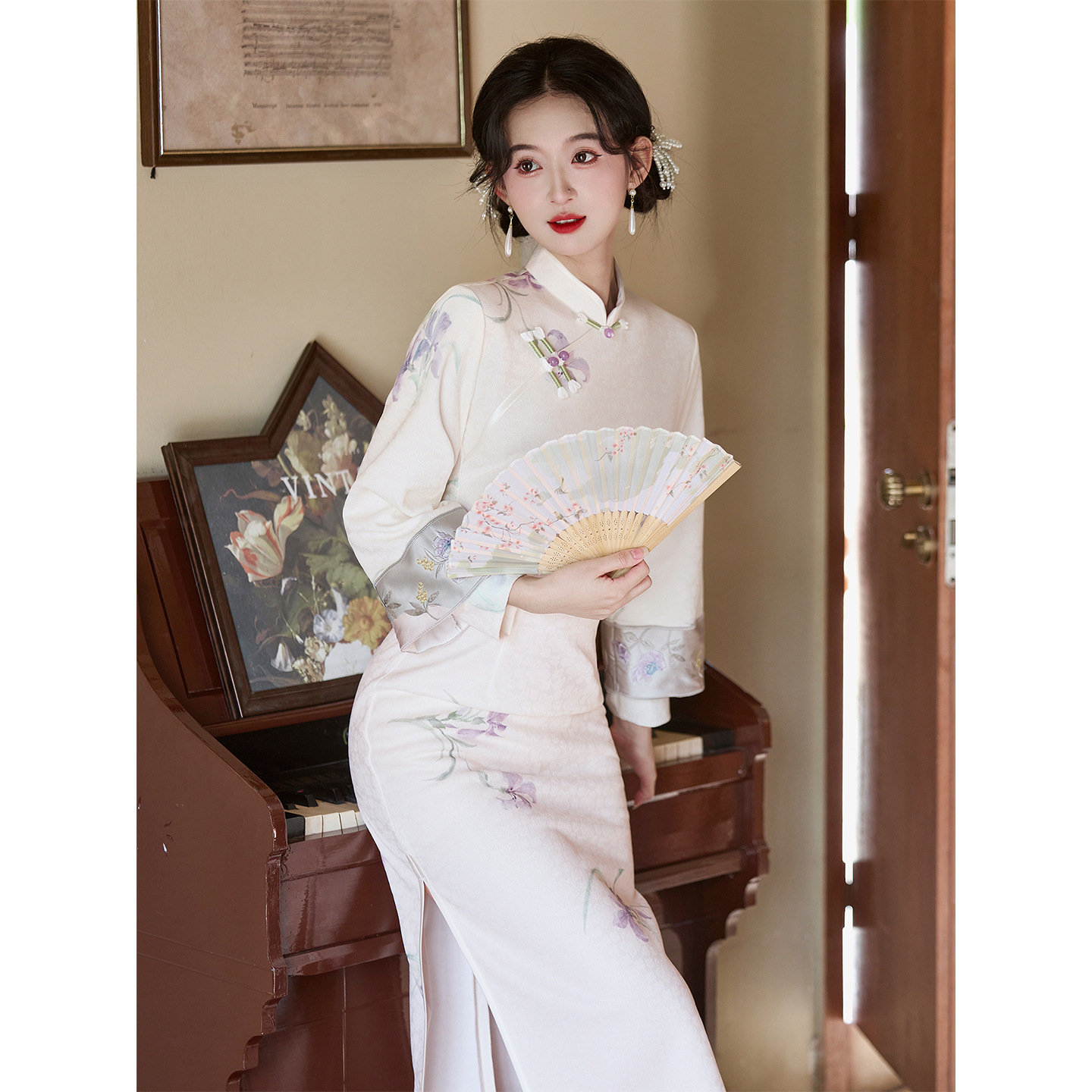 薄紫の花のチャイナドレス秋と冬の2024の新型のハイエンドの修身は気質の新しい中国式の日常を改良して着ることができます。