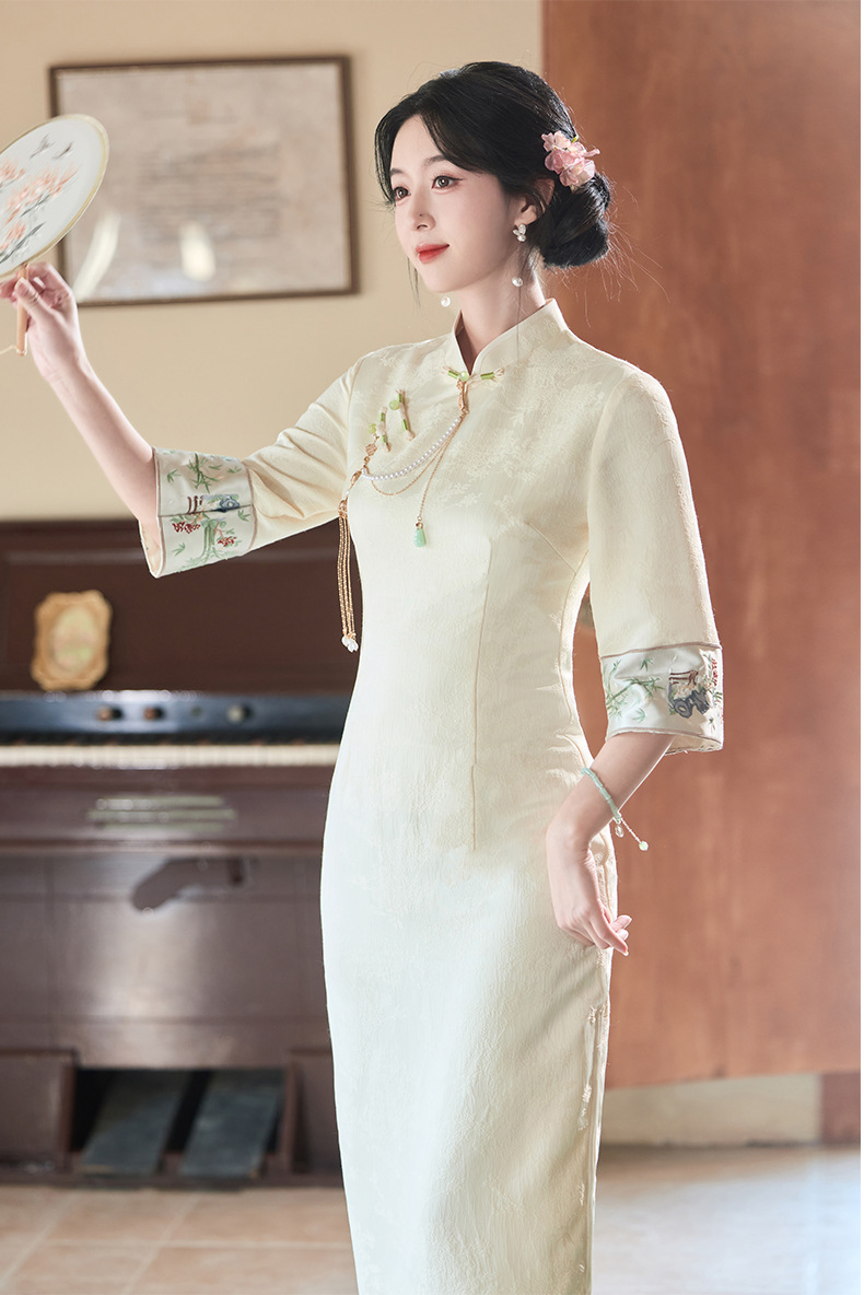 高端旗袍2025新款秋冬季加绒加厚冬装冬天新中式国风连衣裙米白色