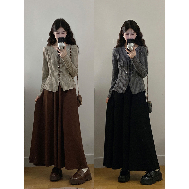 2025秋装新款胖mm大码女甜美坑条针织上衣中长款半身裙套装
