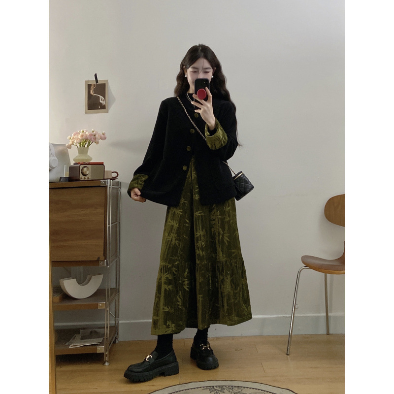 肥七七現物の大きいサイズの婦人服の太ったmmの新型の新しい中国風のコートの暗い紋様のジャカードのベルベットの半身のスカートのスーツ