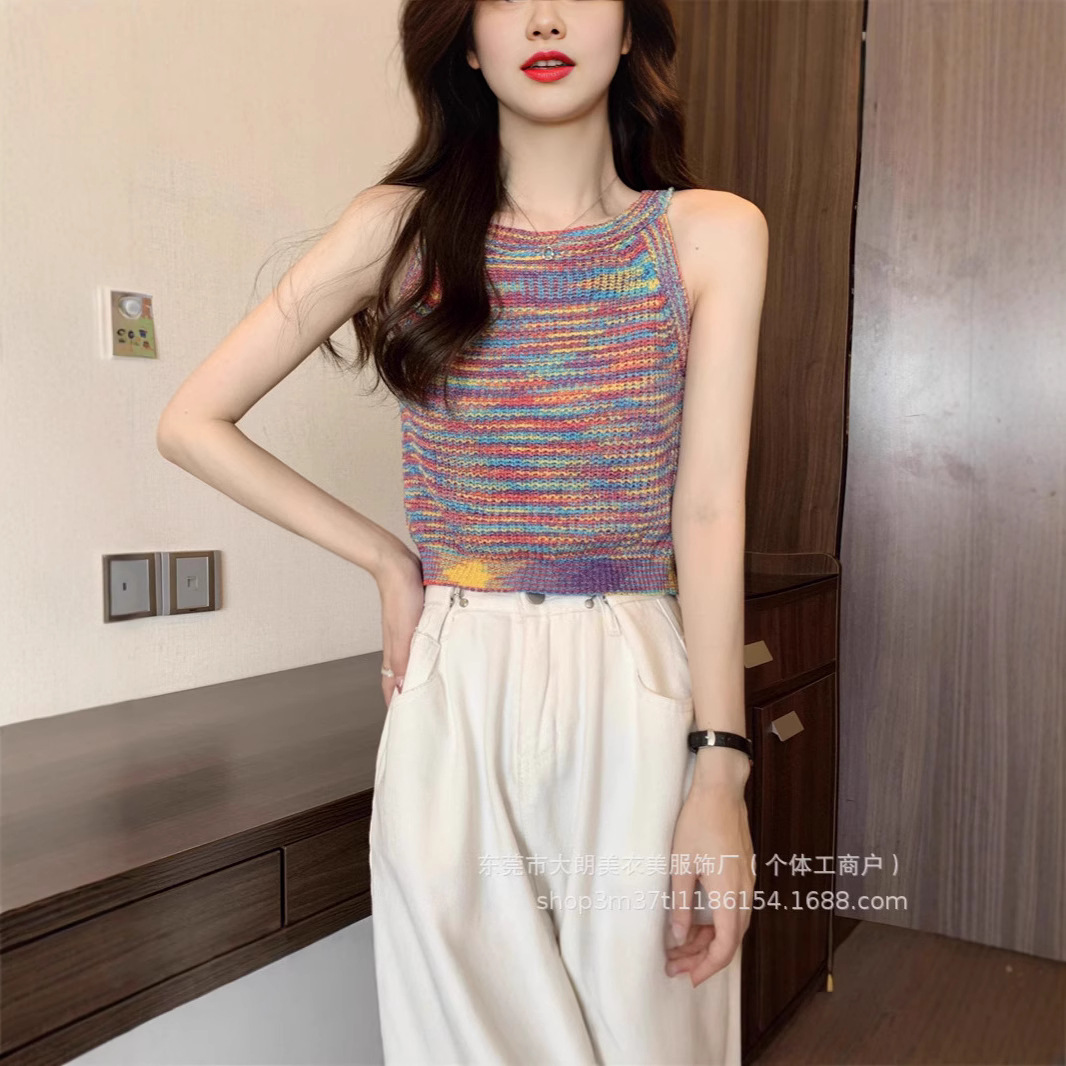 甘くて辛い虹の縞のニットの小さいサスペンダーのベストの女性の中でネットの赤い爆発のノースリーブの短いタイプの独特な上着を掛けます。