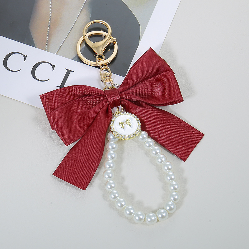ins新款小香风珍珠蝴蝶结钥匙扣包包挂饰手腕式手机挂绳装饰配饰