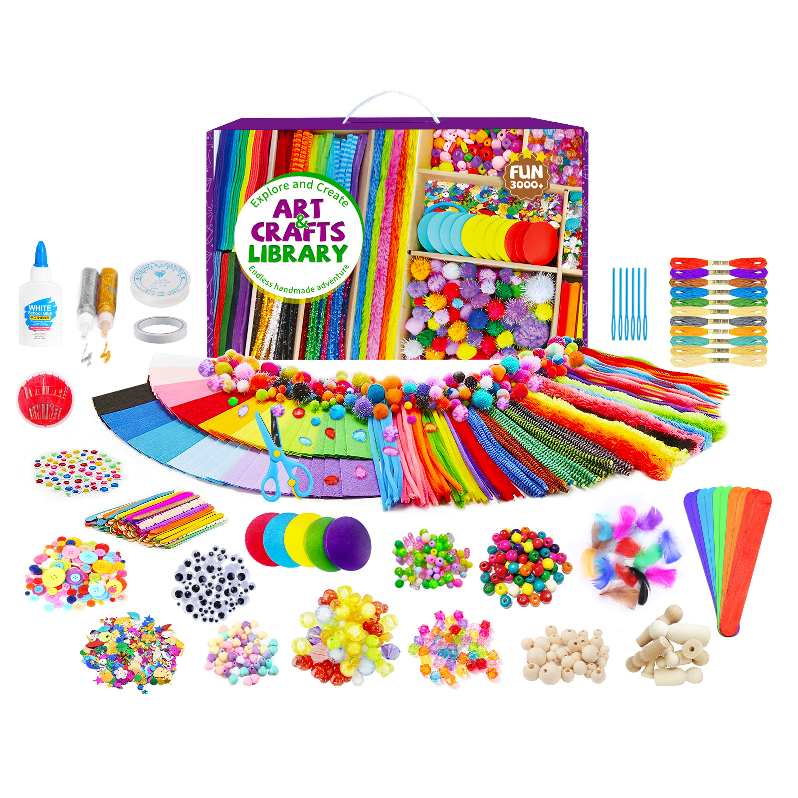 3000pcs + 毛玉条手工芸品ギフトボックスセット子供豪華芸術用品巨大工芸箱