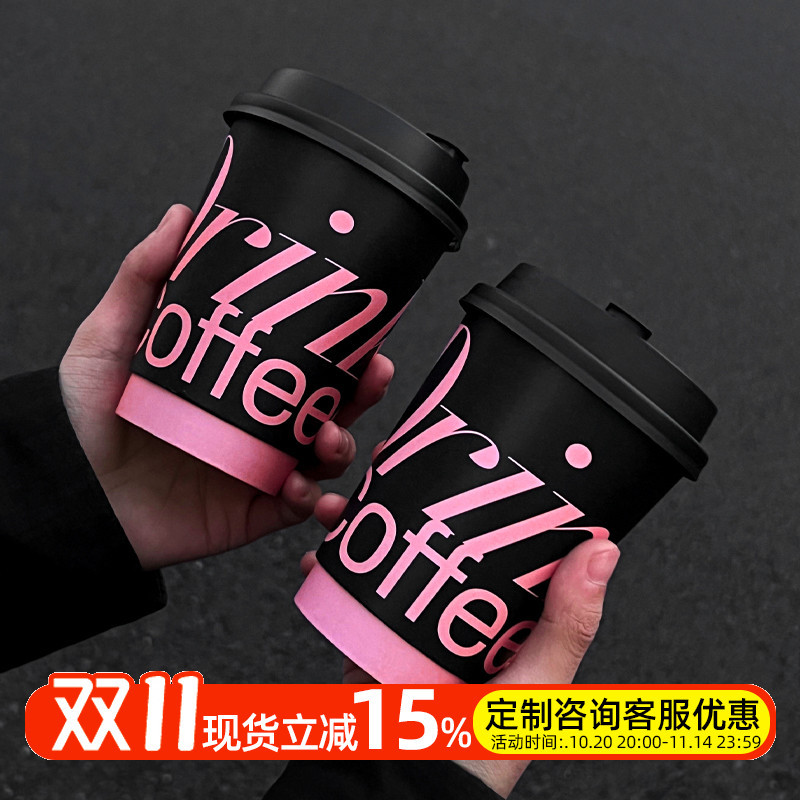 网红黑粉甜酷风咖啡纸杯一次性奶茶杯带盖商用外带打包加厚热饮杯