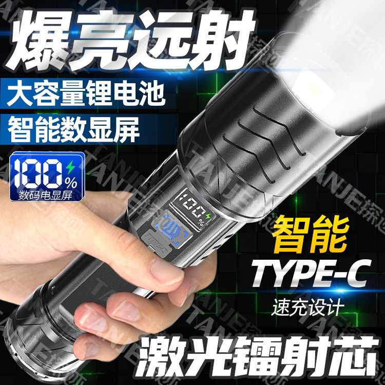新款强光手电筒伸缩变焦Type-c充电大功率电量显数字屏户外手电筒