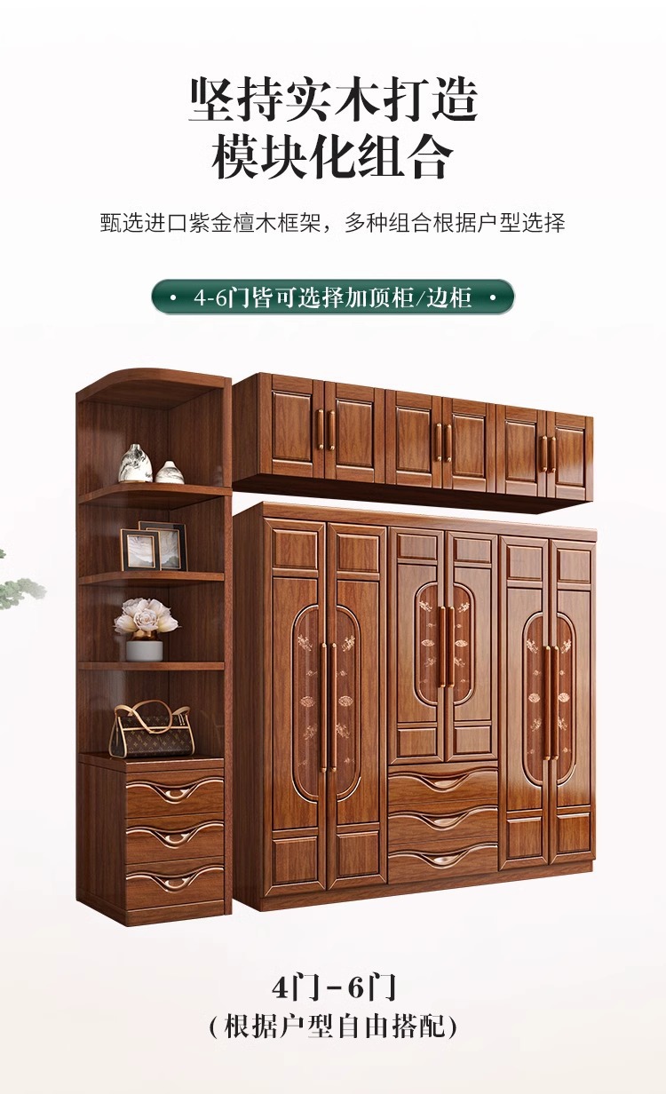 新しい中国風のハイエンドモダンな紫檀無垢材ワードローブシンプルな大家族収納キャビネットワードローブホームベッドルーム