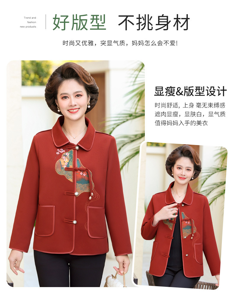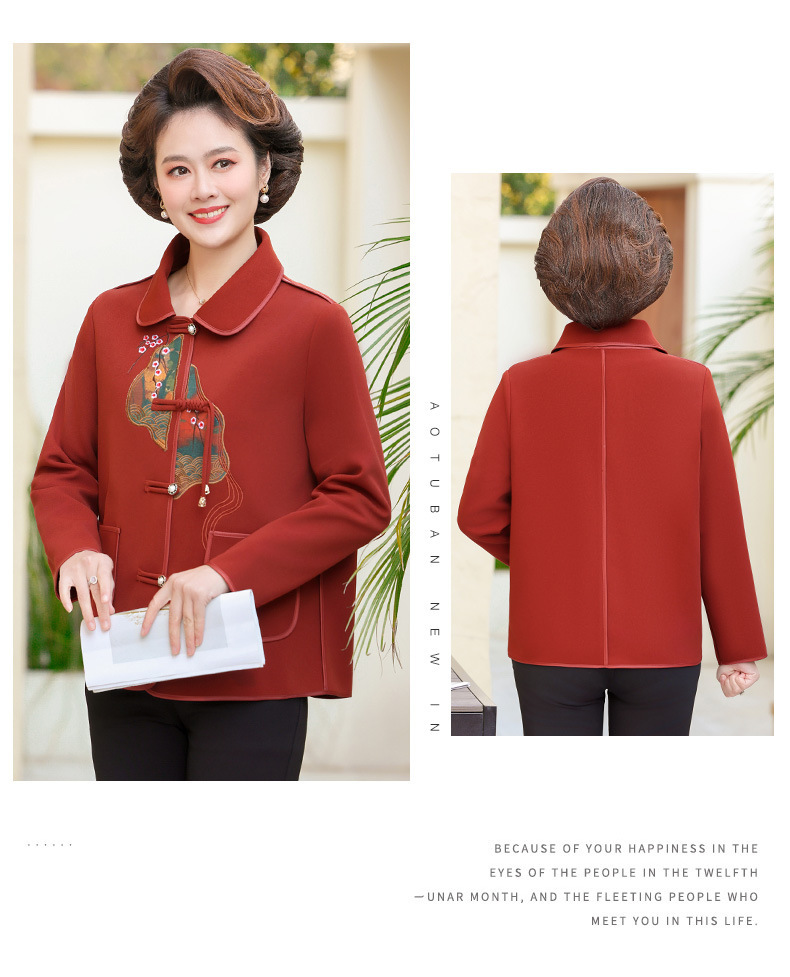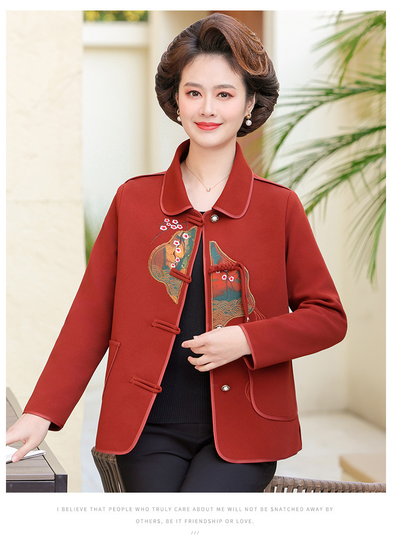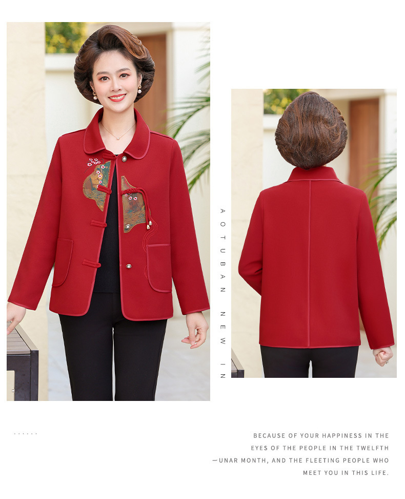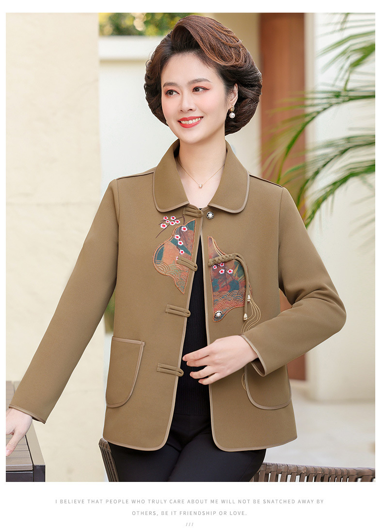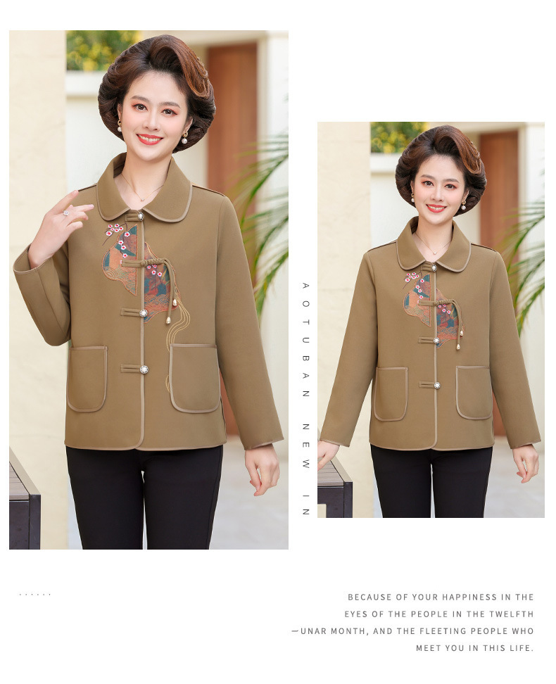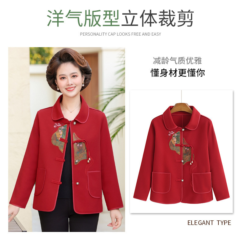 お母さんの春の服のコートの国風の刺繍の小さい上着の中年の女性の50歳の中高年の婦人服の洋風のジャケット