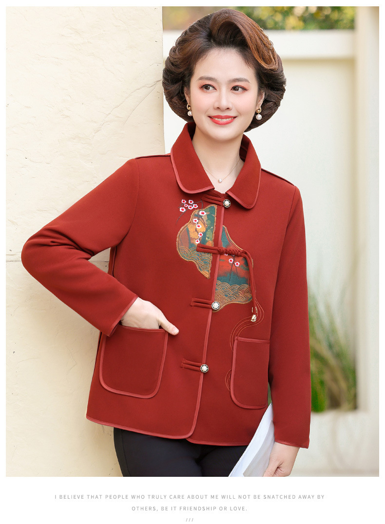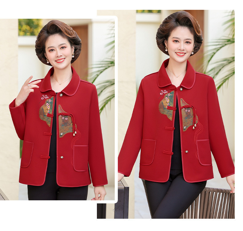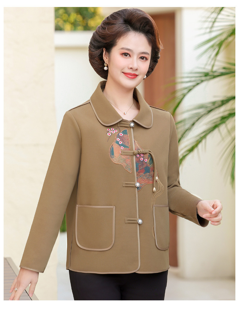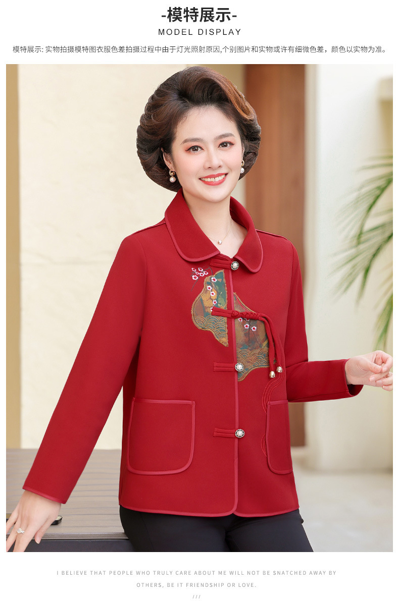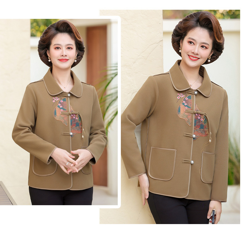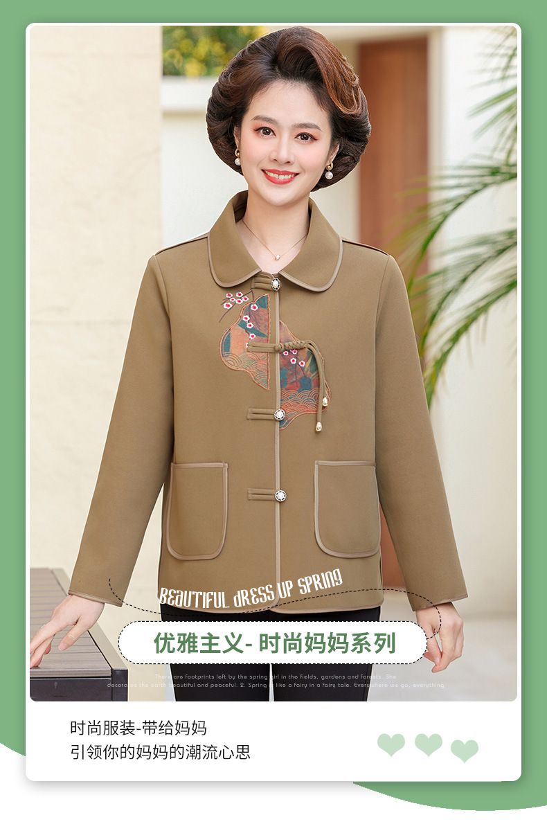 お母さんの春の服のコートの国風の刺繍の小さい上着の中年の女性の50歳の中高年の婦人服の洋風のジャケット
