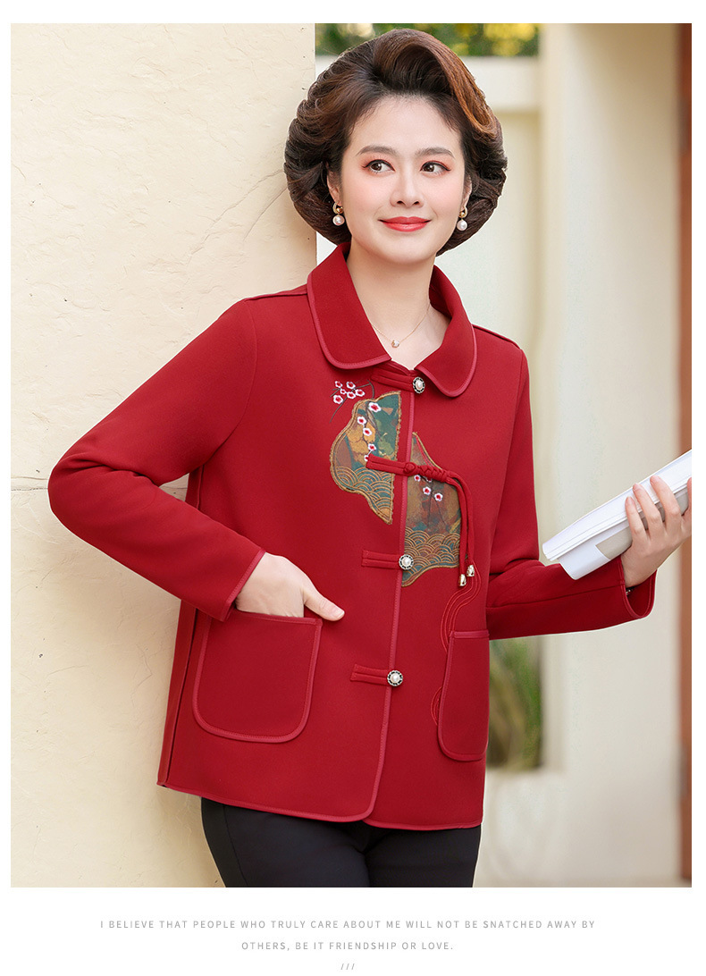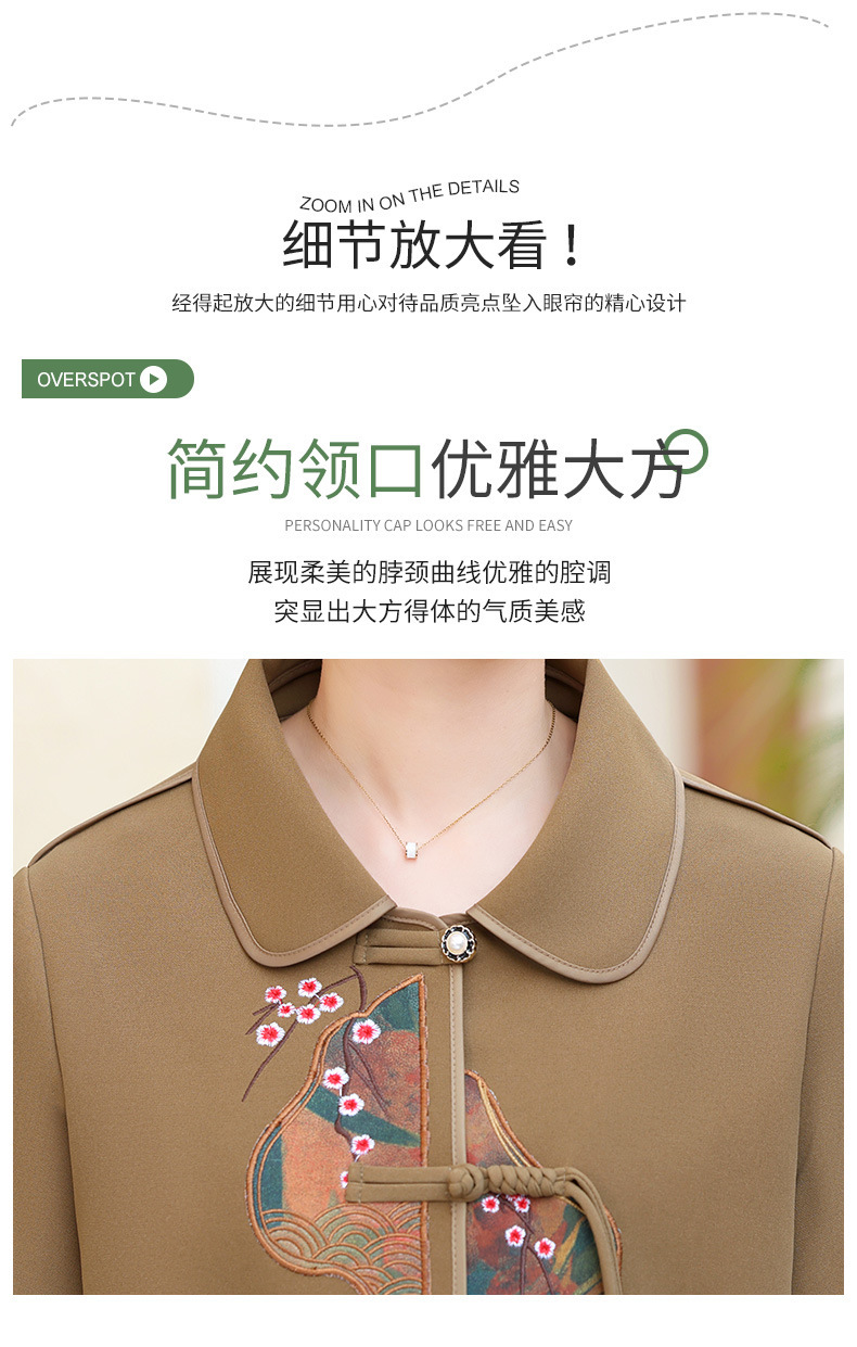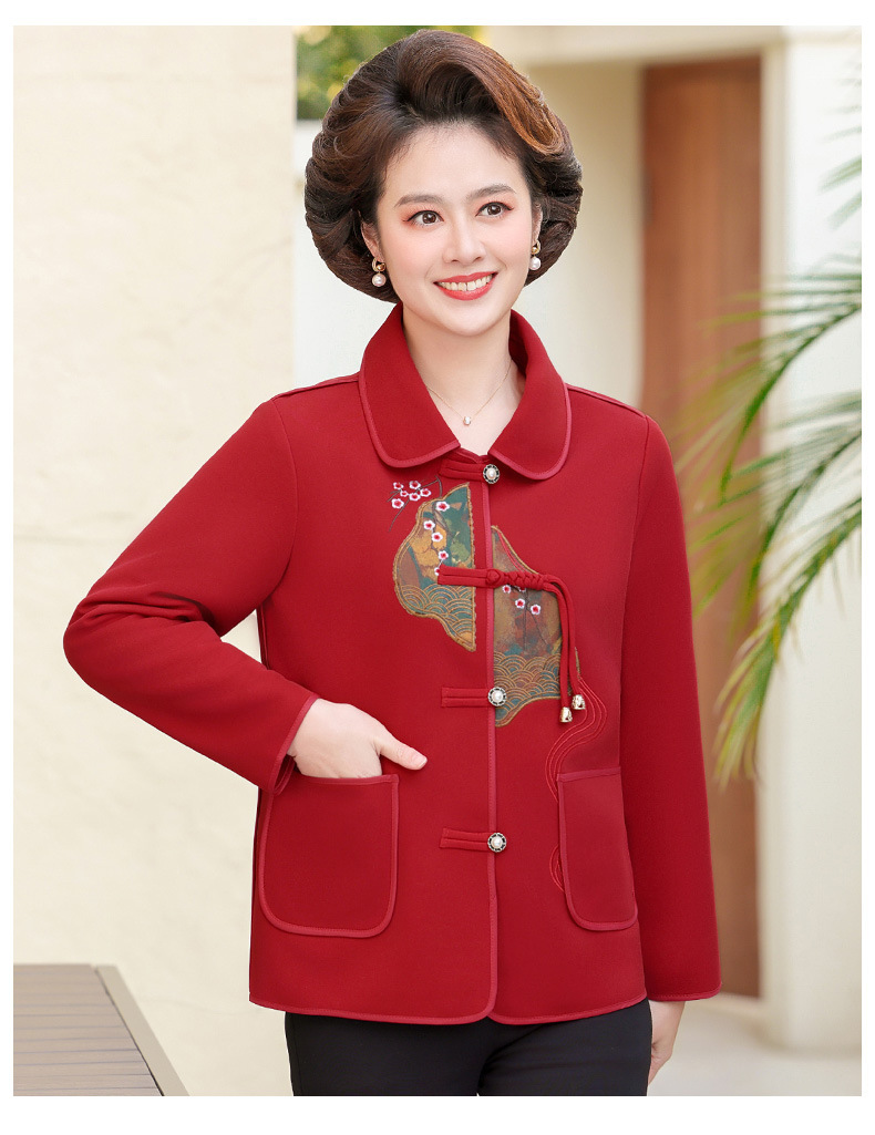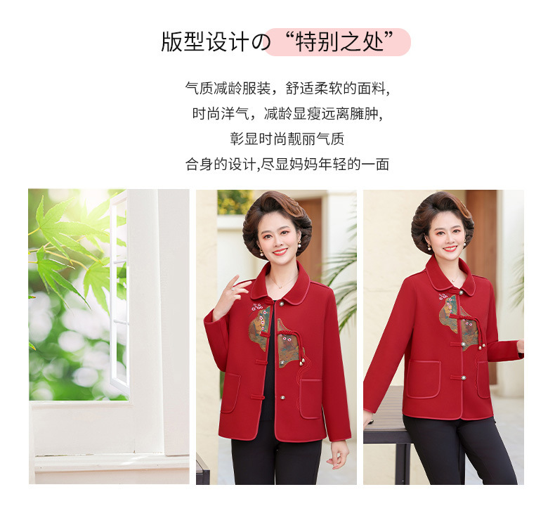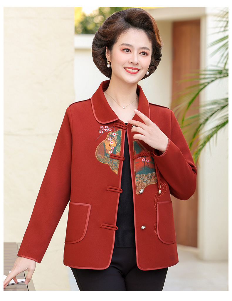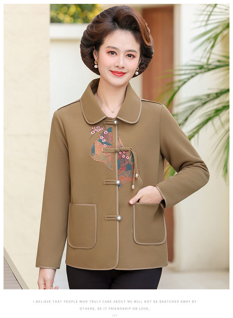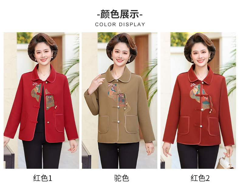 お母さんの春の服のコートの国風の刺繍の小さい上着の中年の女性の50歳の中高年の婦人服の洋風のジャケット