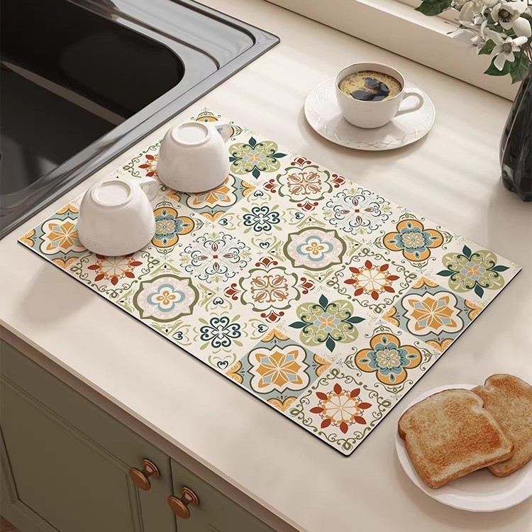 跨境北欧风花砖沥水垫耐脏耐磨垫子厨房台面吸水速干硅藻泥垫子