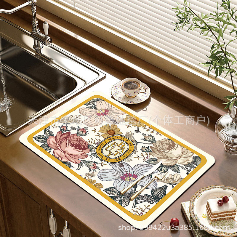 美式复古花卉厨房沥水垫吧台台面隔热垫餐具吸水防滑垫子跨境代发
