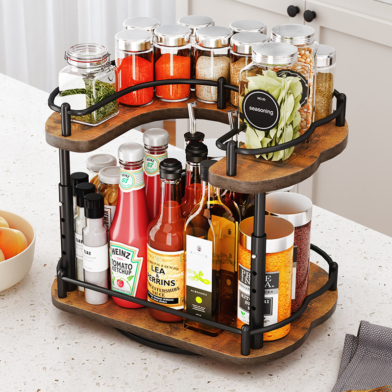 中国風二層U字型木製回転調味料ラック キッチンカウンター調味料ボトル油塩醤油酢収納棚