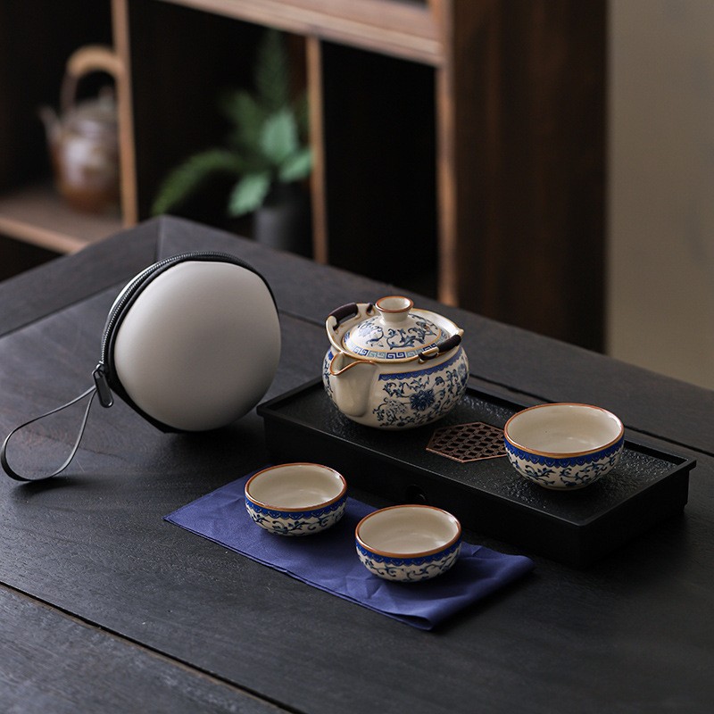 旅行用茶器セット 青花汝窯 アウトドアキャンプ シンプルタイプ お茶作り ポータブル陶器 急須 一壺三杯