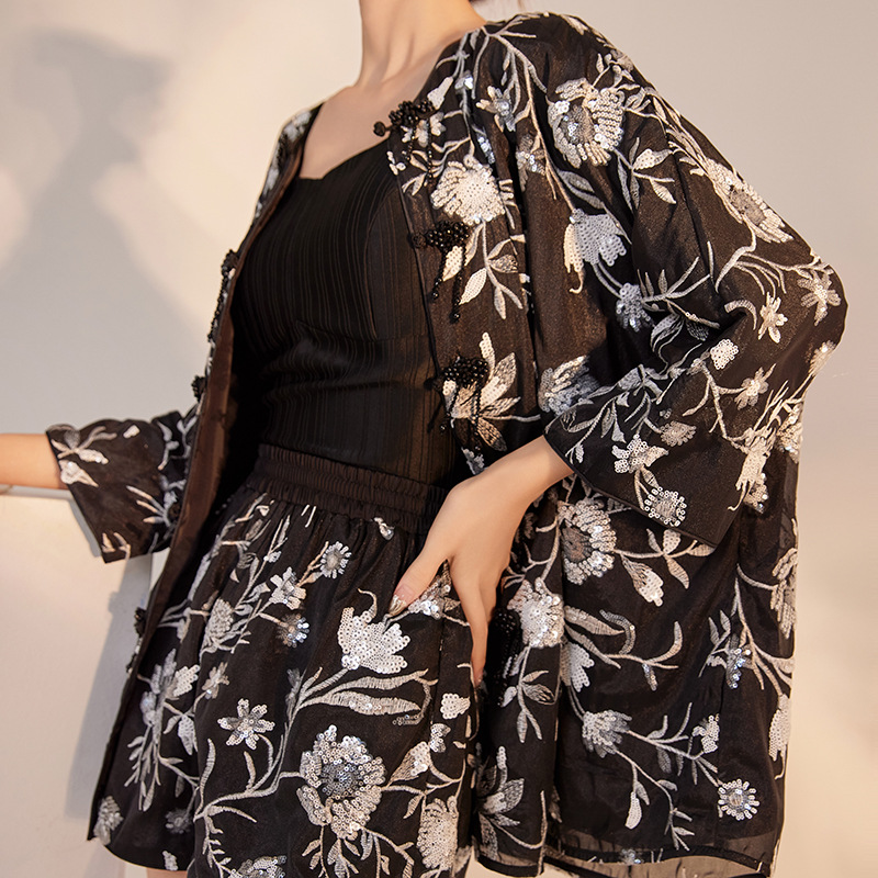 国風2025春のハイエンドビーズ刺繍新中国式绢糸カーディガンジャケットハーフスカートセット女性N1025