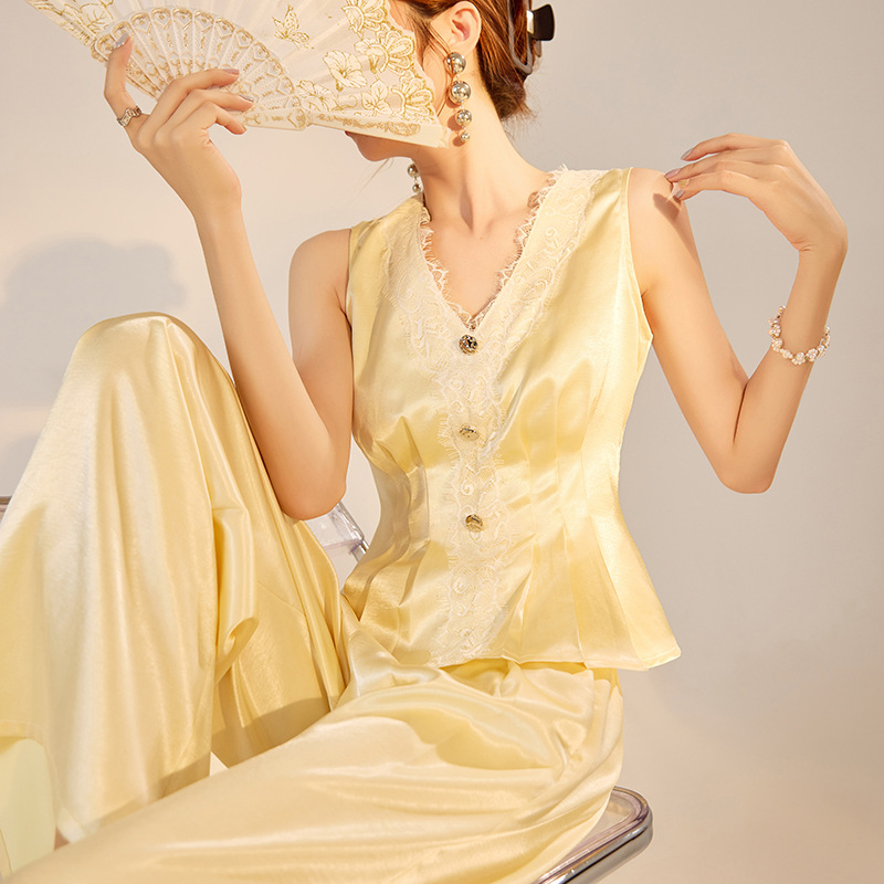 夏のレトロで贅沢なセクシーなノースリーブのレースベストは腰が高くて痩せています。