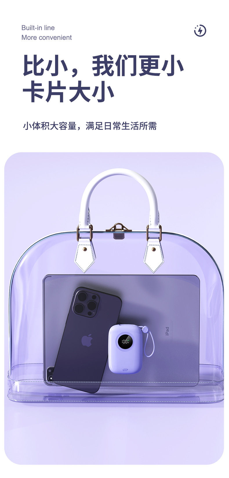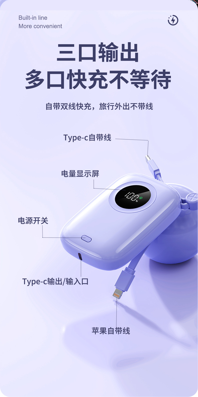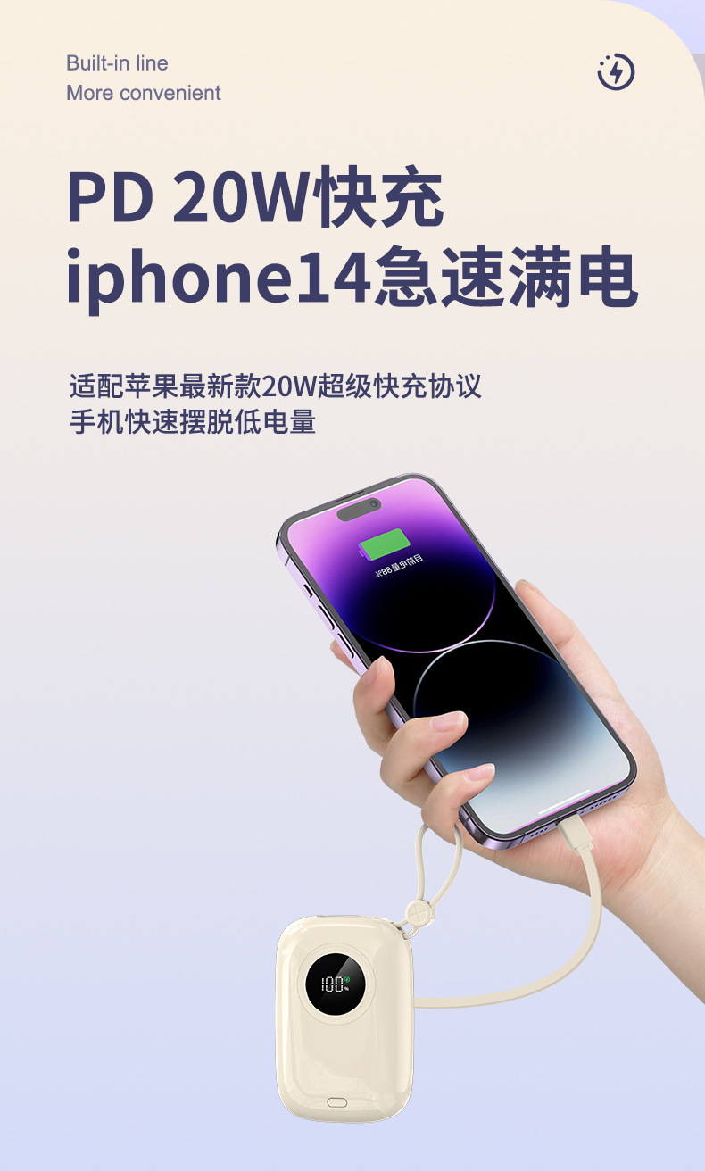 内蔵ケーブル付き120W急速充電モバイルバッテリー20000mAh、ギフト用、ロゴ印刷可能、電量表示、急速充電