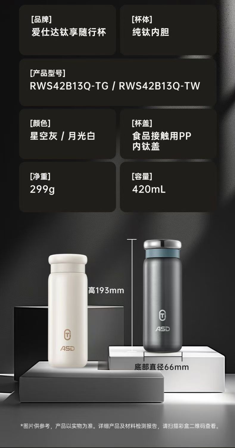 爱仕达钛享保温杯RWS42B13Q-TG便携Ti钛纯钛内胆420ML真空随行杯