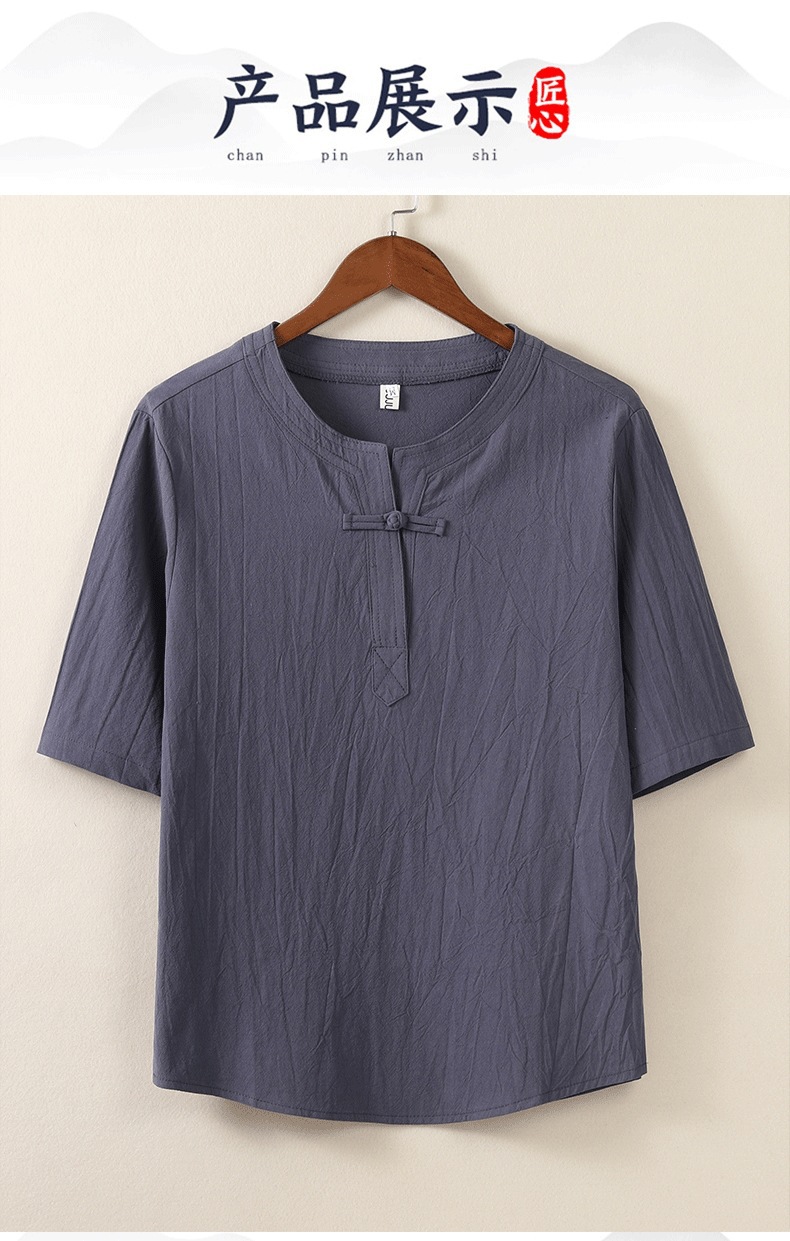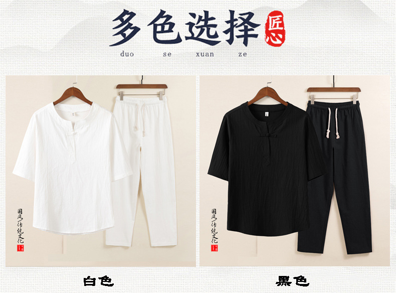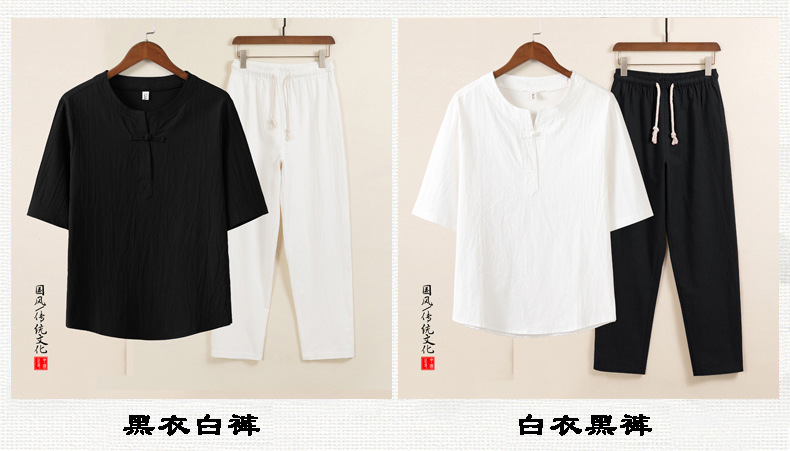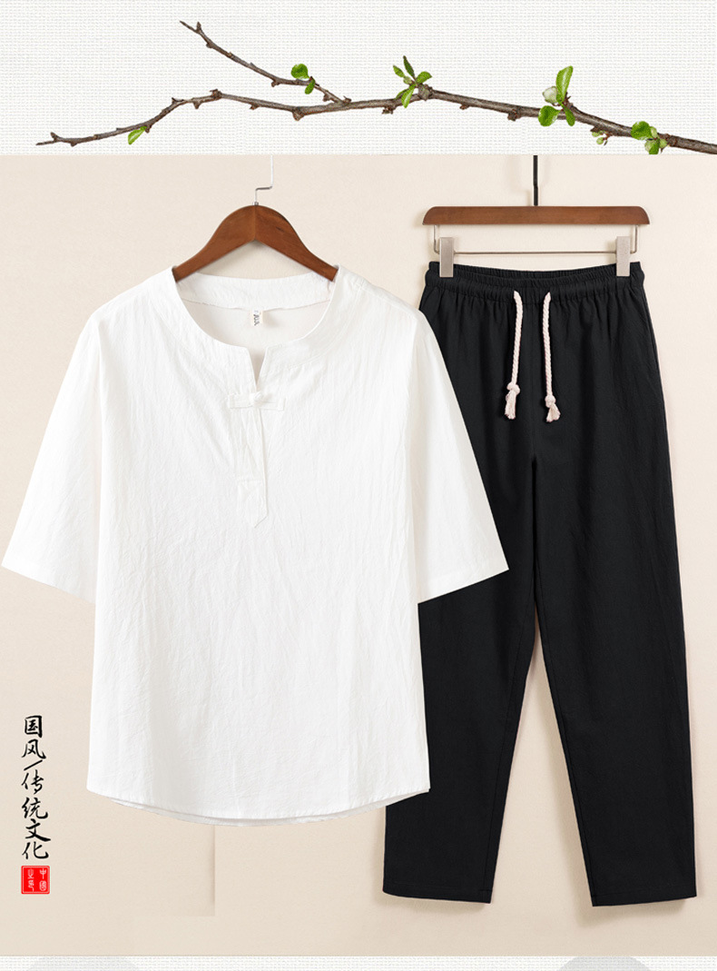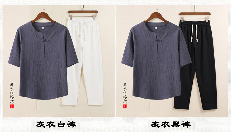 2025夏の新型中国風メンズ綿麻リネン2点セット中年半袖tシャツカジュアルセット卸売り