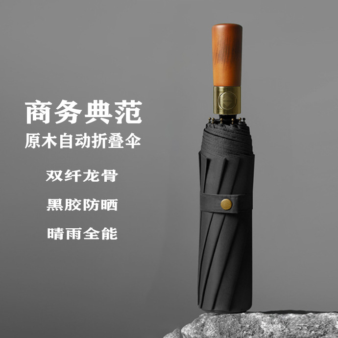 全自動三つ折りメンズビジネス晴雨傘原木10骨黒ゴム日除け傘日焼け止め防風広告日傘